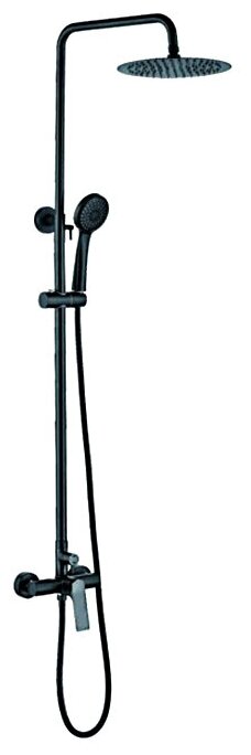 Душевая стойка. Цвет-черный матовый. Без излива. Размер лейки-23см. Количество режимов душевой лейки-3. Длина шланга-150см. Держатель лейки с поворотной частью, с регулировкой по высоте. Тропический душ. Размер верхнего душа-20см. Тип подводки-жесткая