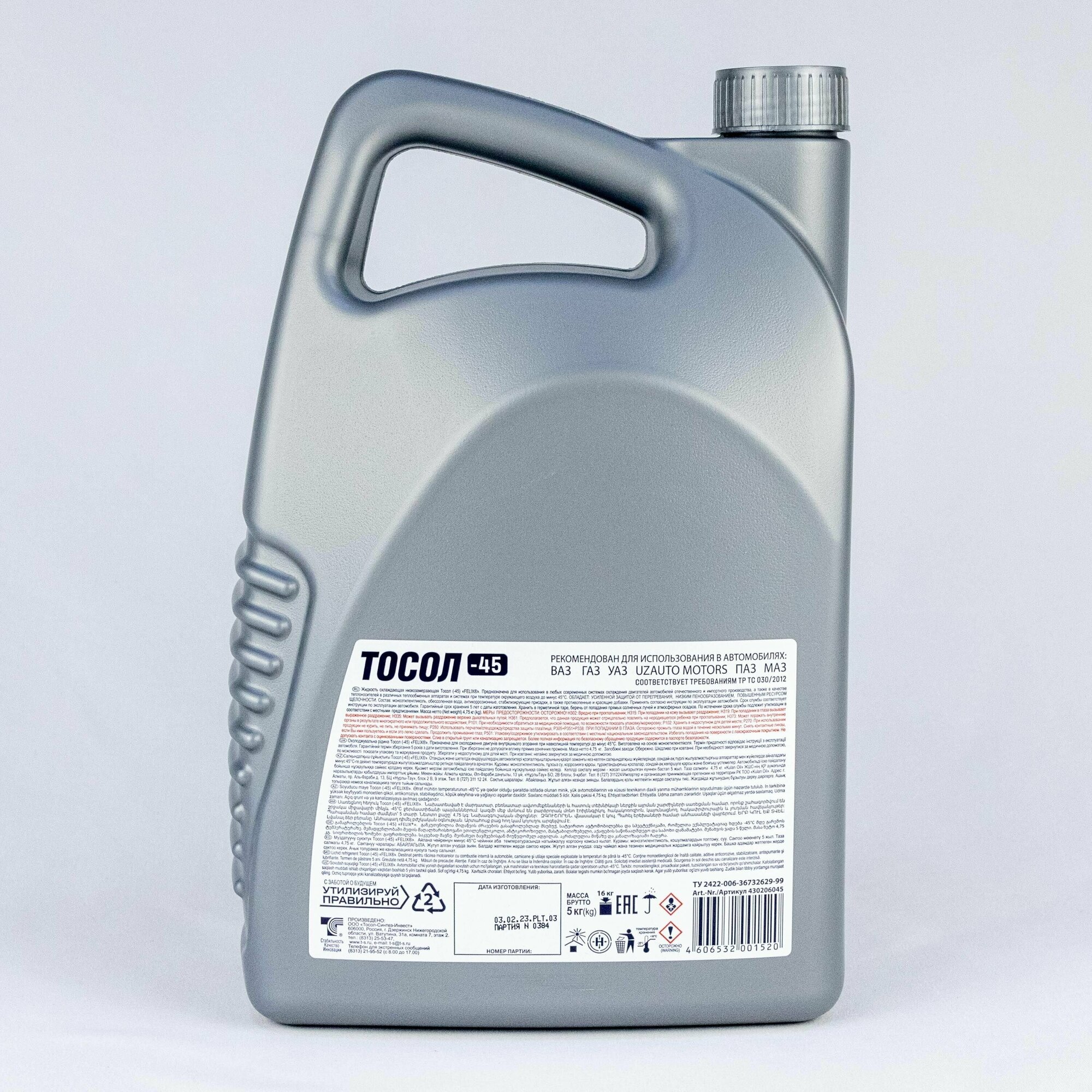 Профессиональный тосол FELIX -45 - современная охлаждающая жидкость (4.75л), низкозамерзающая. Предназначена для использования в любых современных системах охлаждения двигателей автомобилей отечественного и импортного производства, а так же в качестве теплоносителей в различных теплообменных аппаратах и системах при температуре окружающего воздуха до минус 45 град. Срок службы охлаждающей жидкости соответствует инструкции по эксплуатации автомобиля. Основные преимущества Тосол Феликс обладает усиленный защитой от перегрева. Низким пенообразование. Повышенным ресурсом щелочности. Обеспечивает быстрый прогрев двигателя при отрицательных температурах окружающего воздуха до –45°С; Обладает повышенной термостабильностью и теплопроводностью Исключает возможность образования накипи и отложений Имеет оптимальные смазывающие свойства Готов к применению. Соответствует требования TP TC 030/2012 применимость К автомобилям VAZ / ВАЗ, GAZ / ГАЗ, UAZ / УАЗ, UZAUTO MOTORS, ПАЗ, МАЗ состав: моноэтиленгликоль, обессоленная вода, антикоррозионные, стабилизирующие присадки, а также противопенные и красящие добавки.