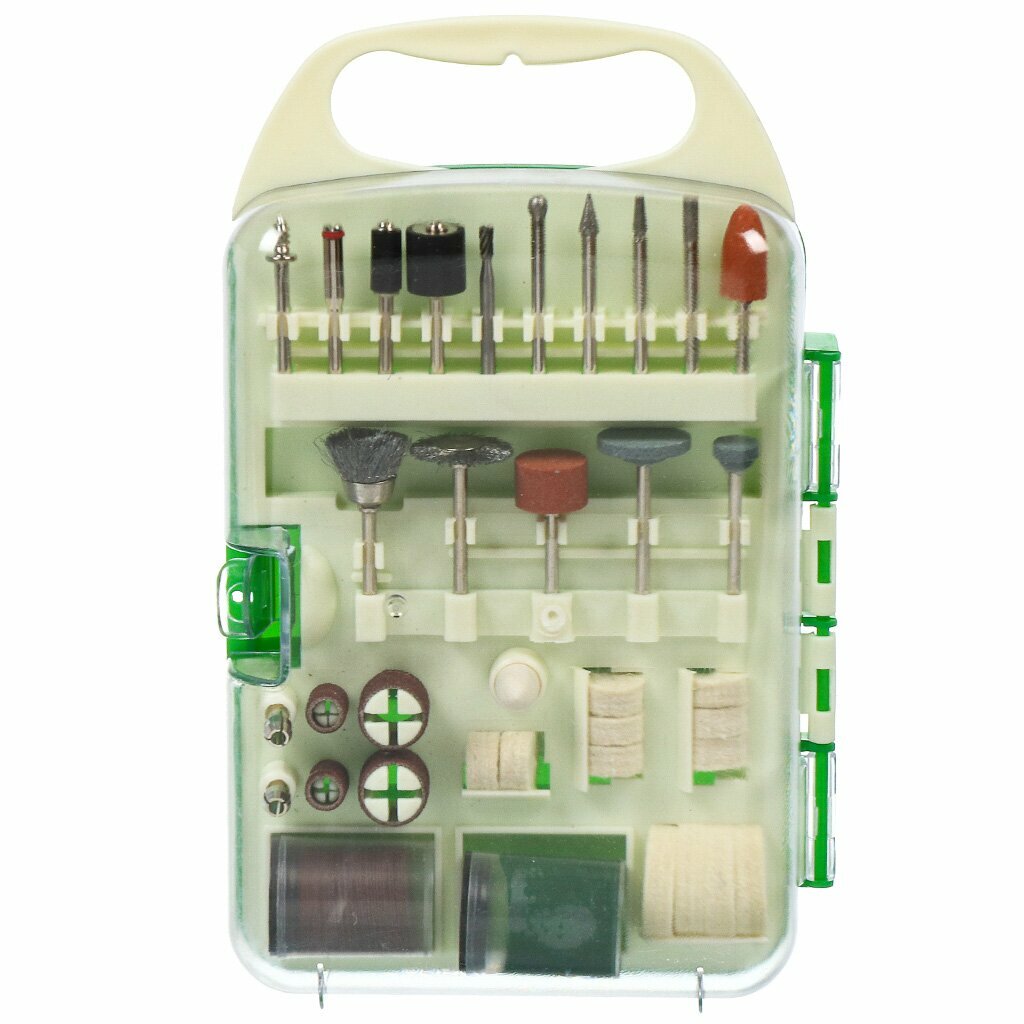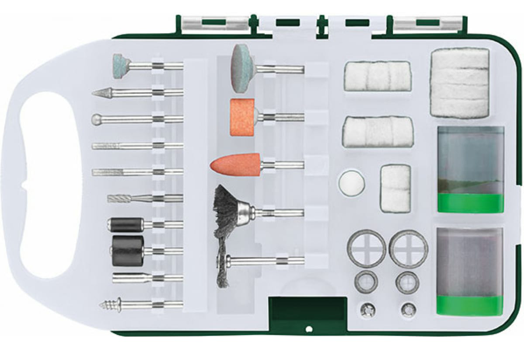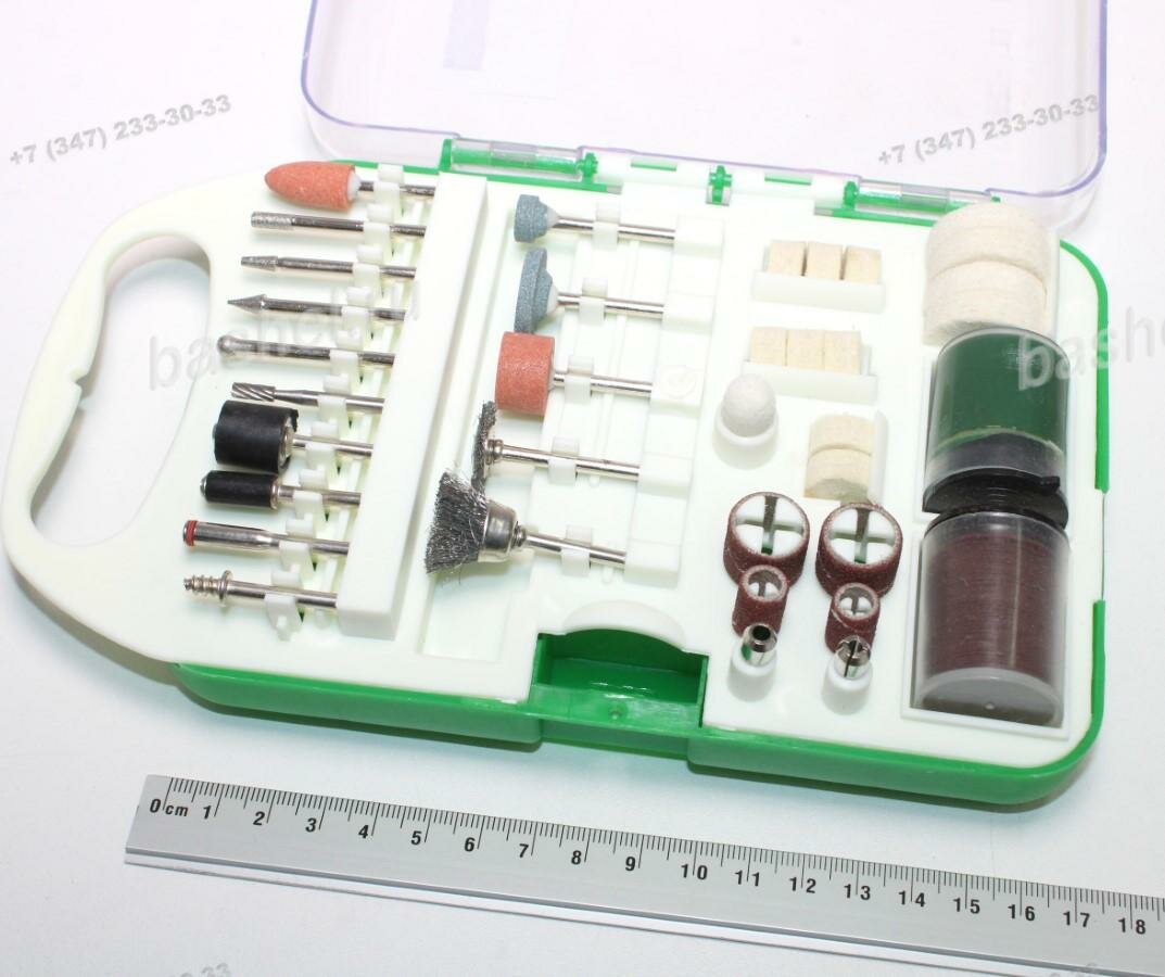 | Комплектация | трубки наждачные; круги войлочные; шарошки алмазные; шарошки-мини по металлу; кордщетки стальные; круги отрезные абразивные; патроны цанговые; паста полировальная; держатели для полировальных насадок и наждачных трубок. |