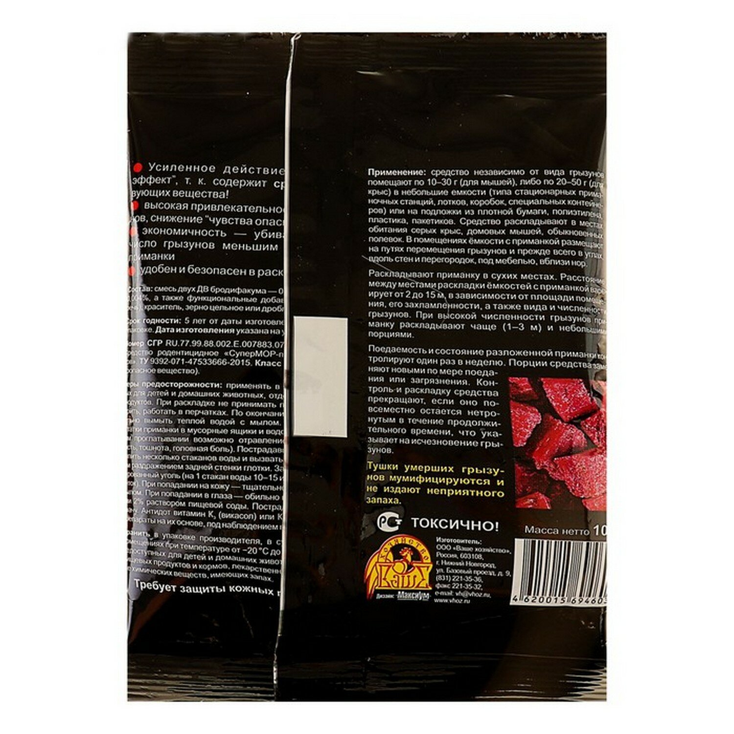 Усиленное действие — содержит сразу 2 действующих вещества!Высокая привлекательность для грызунов, снижение "чувства опасности".Экономичность — убивает большее число грызунов меньшим количеством приманки.Удобен и безопасен в раскладке.Состав: бинарная смесь ДВ антикоагулянтов 1-го и 2-го поколений: дифенацин — 0,012%, бромадиолон — 0,0025%, функциональные добавки, пищевая основа.Применение: приманку помещают на подложки, лотки, специальные емкости по 1 — 2 пакетика от мышей или полевок и по 2 — 3 пакетика от крыс на расстоянии 2 — 5 метров друг от друга. При высокой численности грызунов приманку раскладывают чаще, но меньшими порциями. При истреблении грызунов вне помещений приманку необходимо защитить от дождя и воды, для этого подложки с приманкой прикрывают сверху от осадков или размещают в пустых трубах, укрытиях и т. п. Приманку раскладывают вблизи от нор, путей перемещения грызунов, вдоль стен и перегородок. Места раскладки осматривают через 1 — 2 дня. К приманке, которая частично или полностью съедена, добавляют новую. Загрязненную или испорченную приманку меняют на новую. Нетронутую приманку можно перенести в другое место. Раскладку проводят до исчезновения грызунов.Меры предосторожности: применять в местах, недоступных для детей и домашних животных, отдельно от пищевых продуктов. При раскладке не принимать пищу, не пить и не курить, работать в перчатках. По окончании работ руки тщательно вымыть теплой водой с мылом. Не выбрасывать остатки приманки в мусорные ящики и водоёмы! При случайном проглатывании возможно отравление (признаки: слабость, тошнота, головная боль). Пострадавшему немедленно выпить несколько стаканов воды и вызвать рвоту механическим раздражением задней стенки глотки. Затем принять активированный уголь (на 1 стакан воды 10 — 15 измельченных таблеток). При попадании на кожу — тщательно промыть водой с мылом. При попадании в глаза — обильно промыть их водой или 2% раствором пищевой соды. Пострадавшего показать врачу. Антидот витамин К3 (викасол) или К1 (фитоменадион), препараты на их основе, под наблюдением врача.Хранить в упаковке производителя, в сухих прохладных помещениях, в местах, не доступных для детей и домашних животных, отдельно от пищевых продуктов и кормов, лекарственных средств, а также химических веществ, имеющих запах. Требует защиты кожных покровов!Срок годности: 2 года в нераспечатанной упаковке производителя.