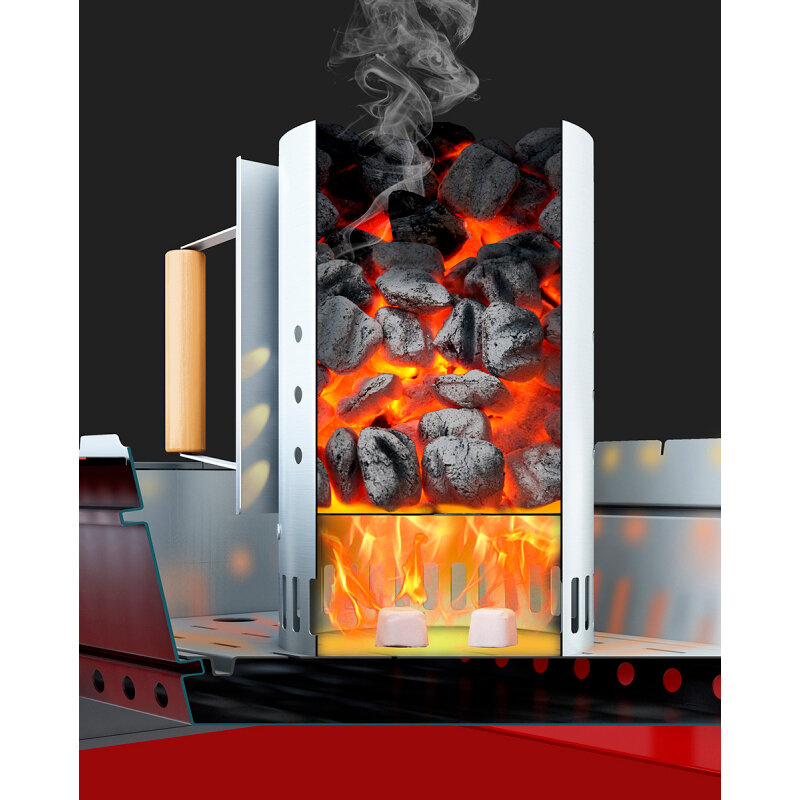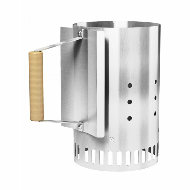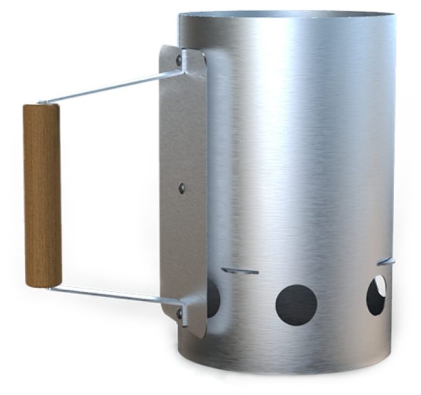 Угольный стартер выполнен из оцинкованной стали. Материал не ржавеет во влажной среде и легко очищается от копоти. Ручка изолирована деревянной вставкой. Легковесное приспособление не занимает много места во время транспортировки. Инструмент можно прихватить с собой на пикник.