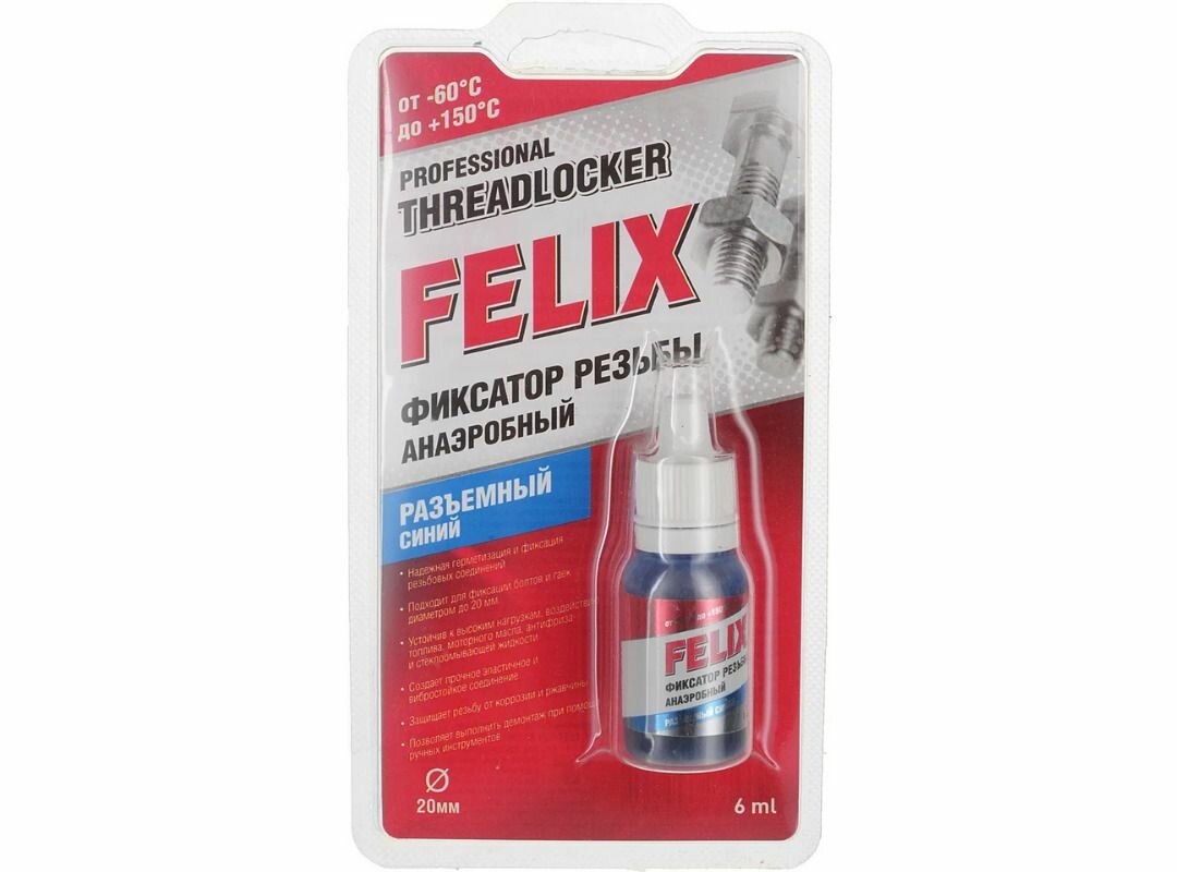 Фиксатор резьбы FELIX (синий; разъемный; 6 мл) устойчив к высоким нагрузкам, воздействию топлива, моторного масла, антифриза и стеклоомывающей жидкости. Область применения: болты клапанной крышки, масляного поддона, водяного насоса, детали ГРМ (включая гайки регулировочных винтов коромысел). Полимеризация герметика происходит в течение двух часов. Окончательную прочность он набирает через 6 часов при температуре не менее 18°С. Последующий демонтаж осуществляется с помощью ручных инструментов. При невозможности демонтажа нужно нагреть резьбовое соединение и удалить фиксатор в горячем состоянии. Для удаления застывшего фиксатора использовать щетку в сочетании с растворителем. Способ применения: Очистить и обезжирить обрабатываемые поверхности. Тщательно встряхнуть перед использованием. Нанести средство на резьбовую часть в количестве, необходимом для заполнения резьбового зазора.