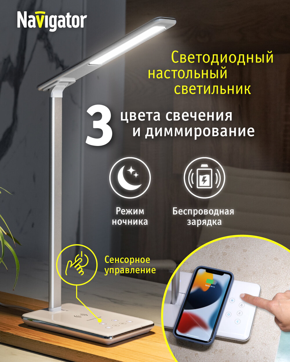 Настольная лампа Navigator – компактный и стильный прибор, который прекрасно впишется в любой интерьер. Светильник настольный Navigator складывается и не занимает много места. Его легко можно переносить и устанавливать там, где вам это необходимо. Настольная лампа светодиодная - идеальный выбор для школьника: отлично подойдет для уроков, чтения и письма, ведь она излучает мягкий рассеянный свет без пульсаций и слепящего эффекта, а значит абсолютно безвредна для детских глаз. Сотрудники сферы красоты также оценят настольную лампу led по достоинству: ее удобно использовать для маникюра, наращивания ресниц и других косметологических процедур. Рабочая лампа настольная имеет 4 режима освещения, которые вы можете настраивать в зависимости от условий работы и предпочтений: теплый ( 3000 К ), средне-теплый ( 3500 К ), нейтральный( 4500 К ) и холодный дневной ( 5500 К ) свет. Регулировка осуществляется с помощью сенсорной панели на основании прибора. Также регулируется яркость настольного светильника, его можно диммировать от 10 до 100 %. В настольной лампе предусмотрена возможность автоматического отключения через 1 и 2 часа. Важной особенностью led светильника настольного Navigator является наличие беспроводной зарядки для мобильных устройств (поддерживающих стандарт питания Qi), кроме того, на светильнике ест USB-разъем, также позволяющий заряжать смартфон и другие приборы (USB – кабель в комплекте)Современные светодиоды в данной модели настольного светильника рассчитаны на 50 тысяч часов (это более 5 лет непрерывной работы). Лампа настольная белая Navigator имеет лаконичный современный дизайн, который прекрасно впишется в интерьер любого пространства – от кабинета до детской и от гостиной до кухни.Световой поток настольной лампы для школьника 290 Лм, длина провода 1.2 м.