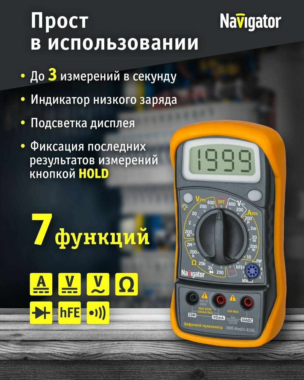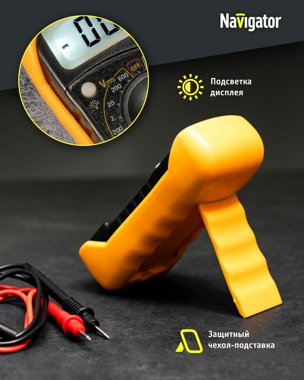 Цифровые мультиметры ''Navigator'' используются для проведения измерений электротехнических параметров сети и приборов при электромонтажных работах в быту и на производстве. 3,5 разрядный ЖК-дисплей с автоопределением полярности, максимальное показание дисплея 1999. Надежный многопозиционный переключатель режимов работы и пределов измерений. Оптимальная скорость: 2-3 измерения в секунду. Автоматическая индикация перегрузки. Тестовые щупы и батарея в комплекте. Защитный чехол-подставка. Подсветка дисплея. Фиксация последних результатов ''Hold''. Эргономичная компактная конструкция.