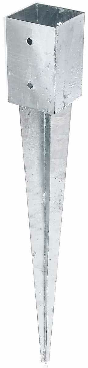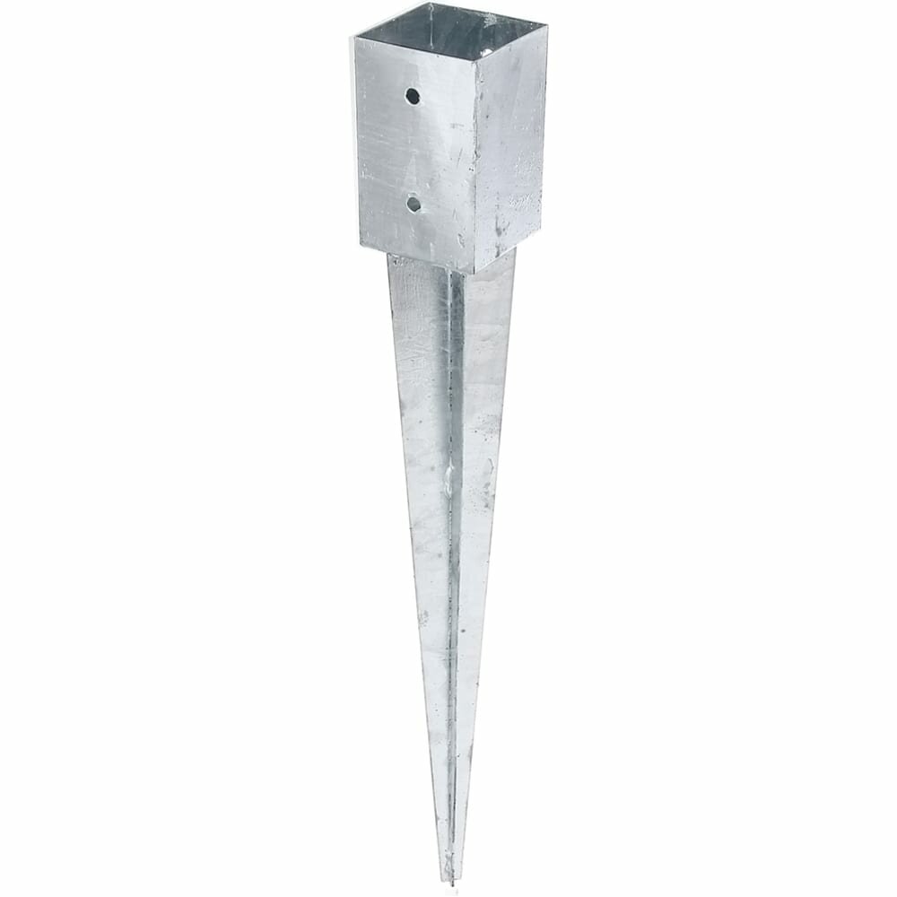 **Опора забивная г-оц. 91x91х150х750** предназначена для вбивания непосредственно в грунт. Крестообразная форма острия обеспечивает необходимую устойчивость. Цельный металлический стакан создает дополнительную конструкционную защиту деревянной стойки, специальные отверстия на дне отводят из древесины лишнюю влагу.