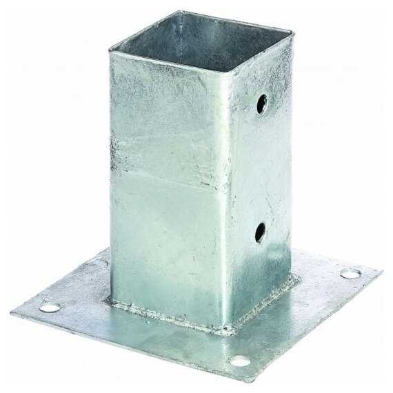 **Опора прикручиваемая 71x71х150** предназначена для прикручивания к основаниям из дерева или бетона. Сварной металлический стакан создает дополнительную конструкционную защиту деревянной стойки, специальные отверстия на дне отводят из древесины лишнюю влагу.