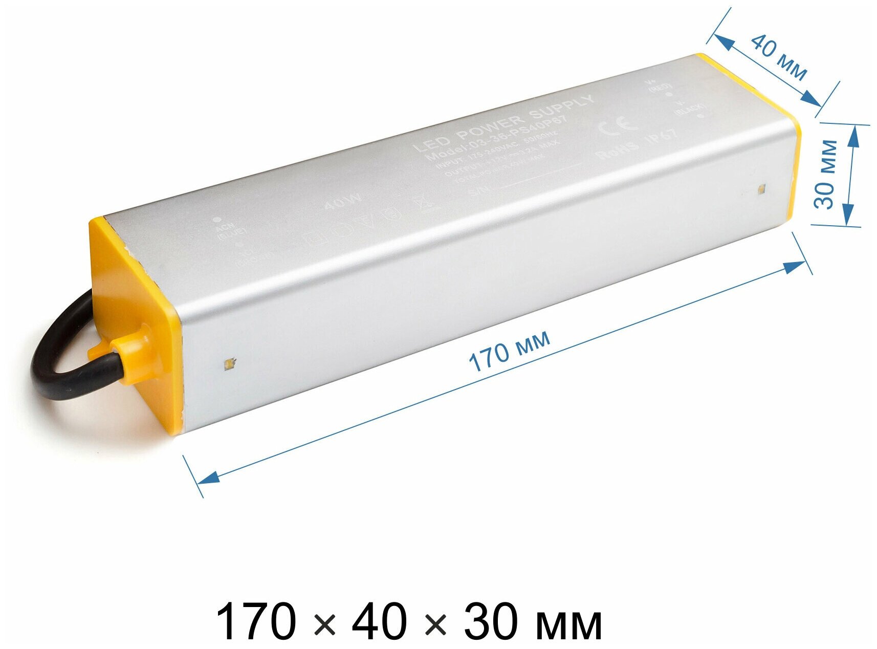 Блок питания PS3-36 из линейки Стандарт с номинальной мощностью 40Вт обладает на выходе постоянным током с напряжением 12В, что делает его идеальным источником питания для таких изделий, как светодиодная лента, светодиодные лампы, линейки и модули с рабочим напряжением 12В. Компактный пластиковый корпус с размерами 170х40х30мм позволит найти место для монтажа в любом интерьере, спрятать в местах с ограниченным пространством. Также он будет легок в подключении благодаря проводам с цветовой маркировкой и обозначениям на корпусе. Кроме всего прочего этот блок питания, благодаря входному фильтру, будет работать при скачках напряжения в диапазоне 175-240В, в то время как выходной фильтр сглаживает пульсацию и защищает ваши глаза. Данный блок питания имеет самую высокую степень защиты от пыли и влаги IP67. Такие блоки питания могут выдержать даже кратковременное погружение под воду, и именно их рекомендуется использовать в тех местах, где есть высокий уровень воздействия влаги и вероятность попадания воды.Преимущества:- Срок службы более 7-ми лет;- Компактный размер, легкий вес;- Высокая эффективность и стабильность;- Встроенная защита от перегрузки; - Встроенная защита от перегрева;- Встроенная защита от короткого замыкания;- КПД > 90%;- Протестирован при 100% нагрузке;- Бесшумная работа;- Отсутствие пульсации;- Высокое качество сборки и многоступенчатый контроль качества на всех этапах производства;- Защищен от проникновения пыли и влаги, приспособлен для работы на улице и во влажных помещениях.