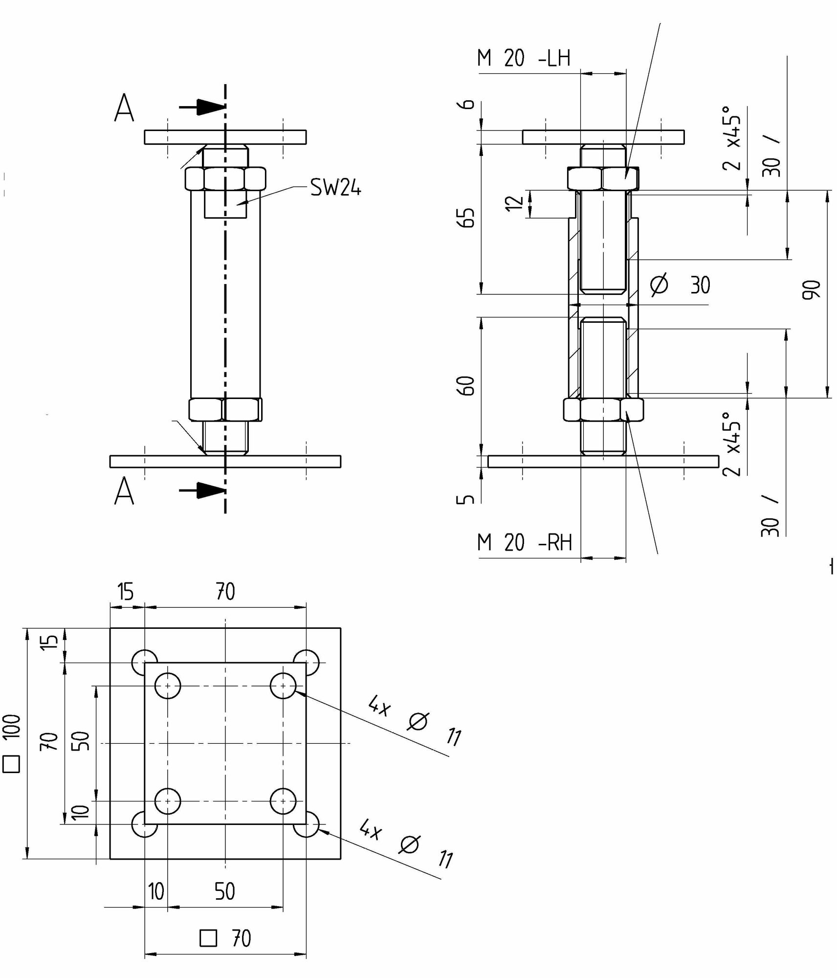 **Опора регулируемая 150-190** предназначена для прикручивания к основаниям из дерева или бетона. Резьбовая штанга M20 делает возможной регулировку высоты опоры в диапазоне 150-190 мм, в том числе и в смонтированном состоянии.