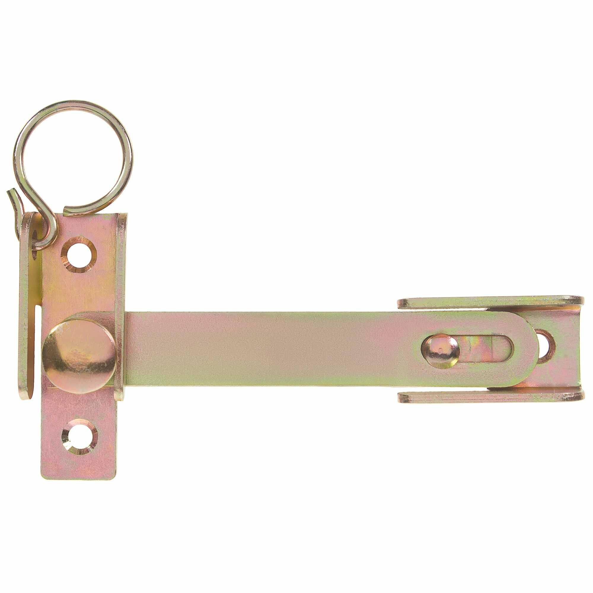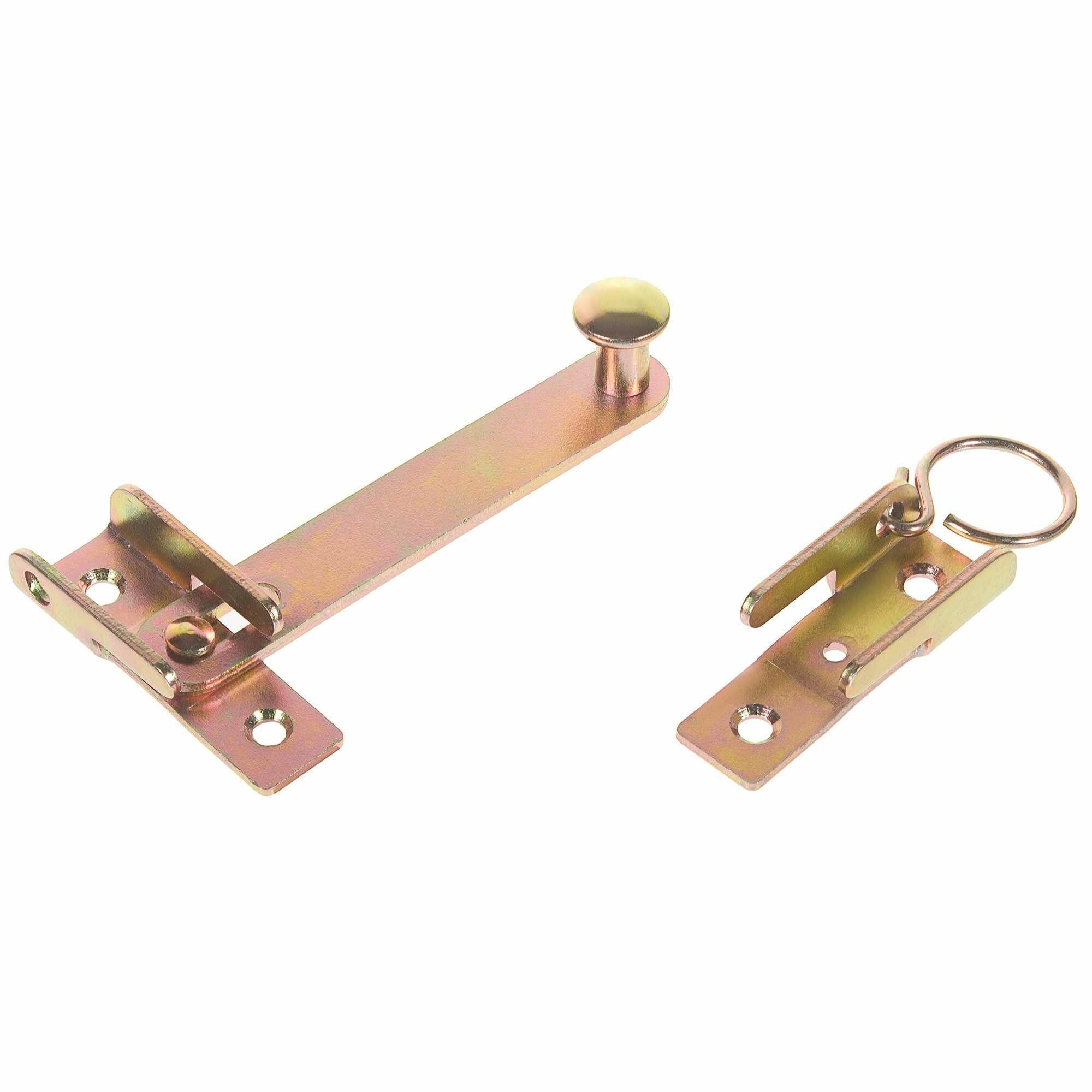 Предназначена для запирания оконных ставен. Крепежное отверстие затвора выполнено в виде направляющей, что позволяет фиксировать затвор в вертикальном положении, когда ставни открыты. Ответная часть снабжена кольцом для удобства открывания ставни. Гальваническая оцинковка желтого цвета позволяет использовать изделие на улице и выигрышно смотрится на древесине.
