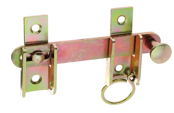 Щеколда GAH ALBERTS оцинкованная 120 мм 314446 предназначена для фиксации створок в закрытом положении. Щеколда оснащена стопорным устройством и кольцом для закрывания створки. Изготовлена из необработанной стали с гальванической оцинковкой желтого цвета. Размеры - 120x65 мм.