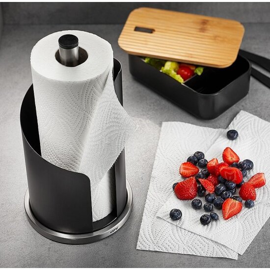 Держатель для бумажных полотенец Gefu Керв изготовлен из высококачественной стали и предназначен для рулонных полотенец высотой до 28 см. Изящная черная стенка-ограничитель удобна для отрывания полотенца. Круглое тяжелое основание держателя предотвращает опрокидывание, скольжение и гарантирует устойчивость. Вы можете установить его в любом удобном месте. Держатель Gefu Керв станет полезным аксессуаром в домашнем быту и идеально дополнит стильные аксессуары Gefu с черными матовыми элементами.