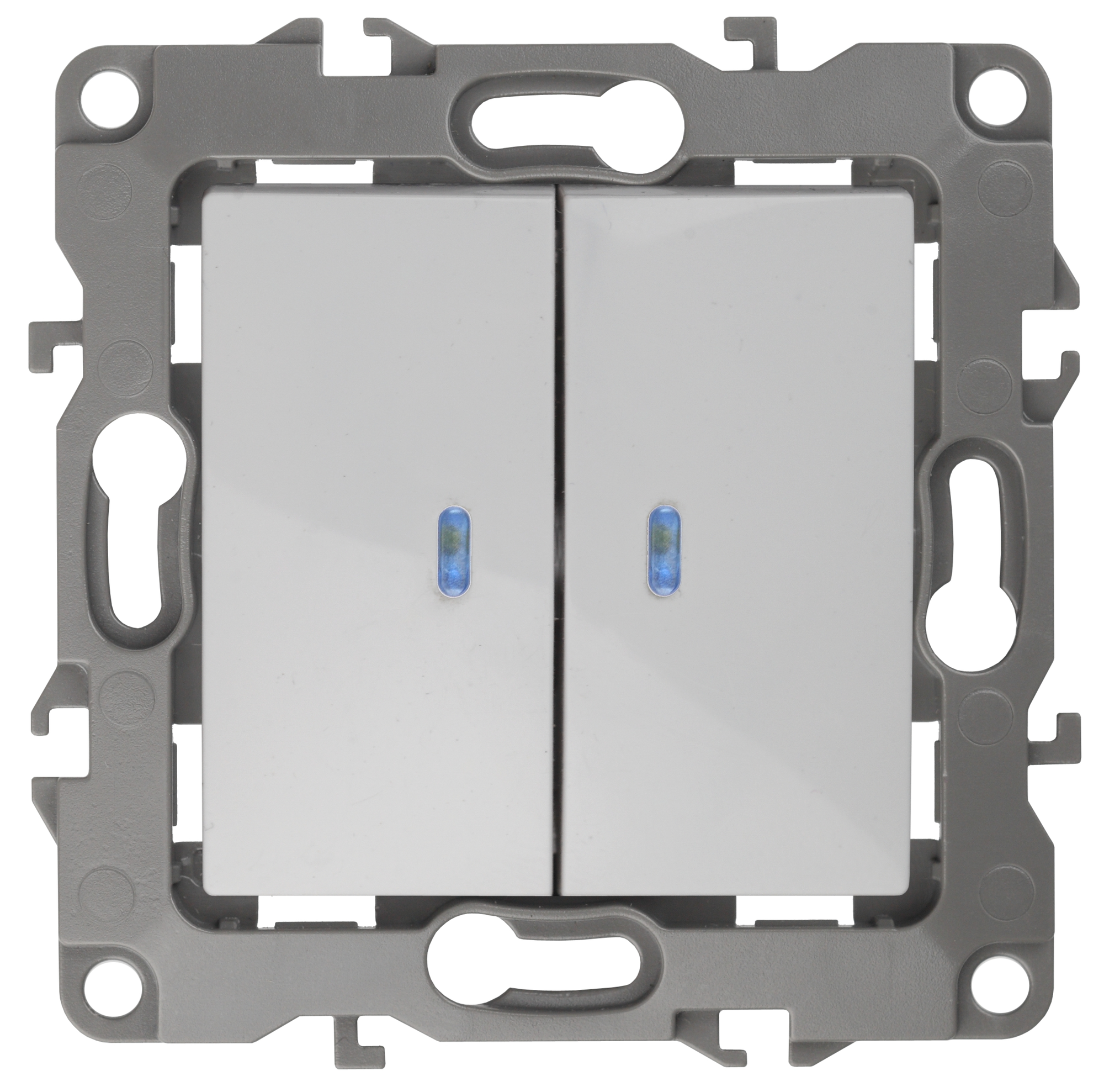 Выключатель 2-клавишный с подсветкой серии Эра 12 скрытой установки сделан из поликарбоната, оснащёно автоматическими клеммами для быстрой и надёжной фиксации жил кабеля в механизме. Парные клеммы обеспечивают соединение шлейфом. Монтаж в подрозетник производится и на лапки, и на винты. Рамки приобретаются отдельно.