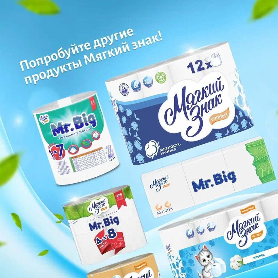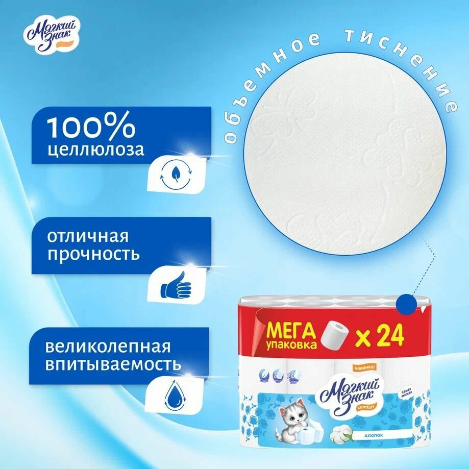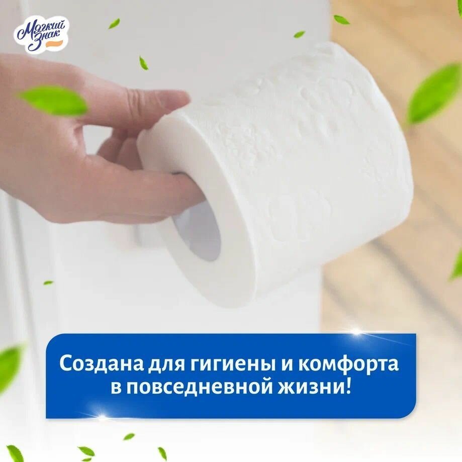 Белая неароматизированная двухслойная туалетная бумага ''Мягкий Знак'' представлена в мега-упаковке (24 рулона) для большой семьи с удобной ручкой для переноски. Произведена из 100% натурально сырья без примесей макулатуры.
