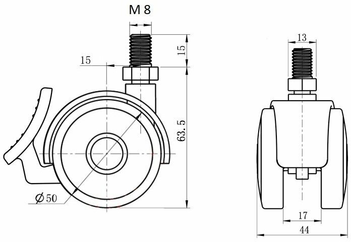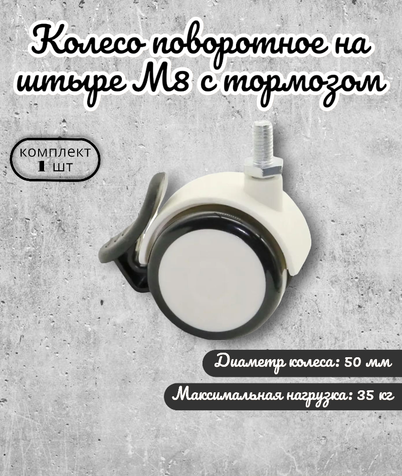 Колесо поворотное 50мм со штырем М8 (8 мм). Шинка - PU (полиуретан). Корпус - прочный АВС пластик. Нагрузка на одно колесо - 35 кг.Мебельные колеса и ролики представляют собой опоры, которые позволяют перемещать мебель в пределах помещения. Колеса для мебели делают уборку более удобной, не повреждают половое покрытие и не оставляют на нем следов. Наиболее распространены ролики для шкафов-купе, столов, кресел и диванов, стеллажей, тумбочек и т. д.К очевидным преимуществам можно отнести:Комфорт: при использовании роликов, перемещение мебели становится гораздо легче и удобнее.Наш магазин - единственный и уникальный поставщик бренда BRANTE на рынке. Торговая марка была официально зарегистрирована еще в 2011 году компанией Прана. С тех пор покупатели из России и стран СНГ имеют возможность недорого приобрести надежные колеса, защелки, ручки, мебельные крючки, а также оконную фурнитуру.колеса для мебели, колеса, колесики для мебели, колесо.