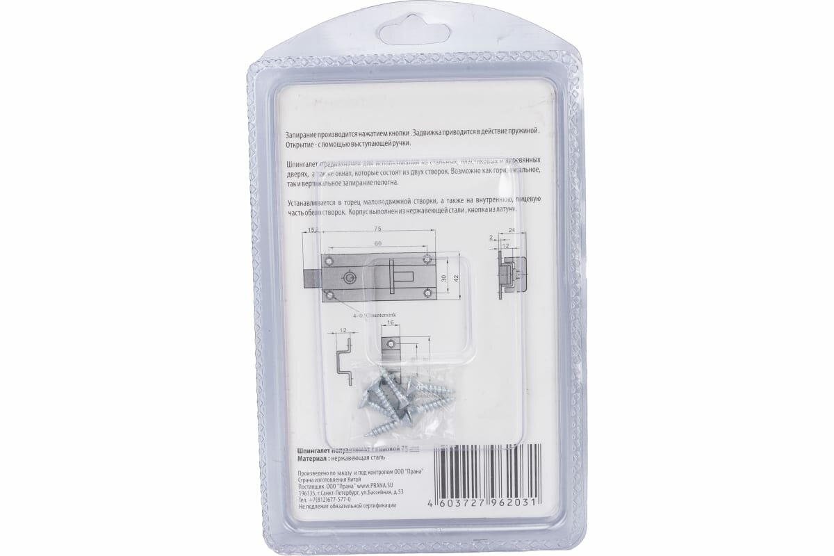 Шпингалет предназначен для использования на стальных, пластиковых и деревянных дверях, а также окнах, которые состоят из двух створок. Возможно как горизонтальное, так и вертикальное запирание полотна. Устанавливается в торец малоподвижной створки, а также на внутреннюю, лицевую часть обеих створок. Открытие производиться нажатием кнопки. Так как корпус выполнен из нержавеющей стали, кнопка из латуни, то его можно устанавливать во влажных помещениях и на улице.