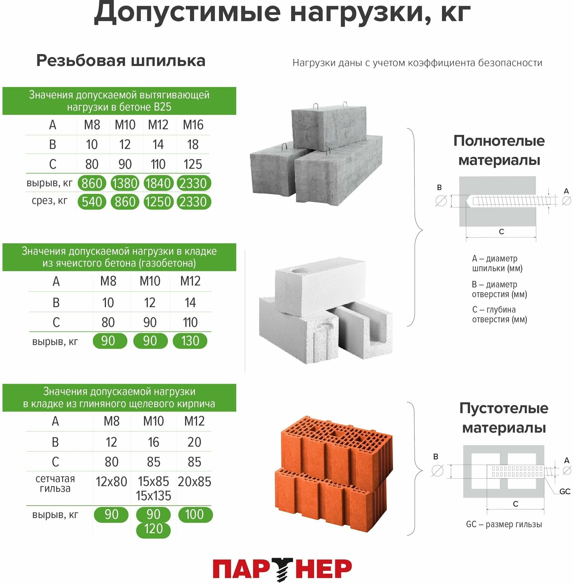 Двухкомпонентная полиэфирная смола без стирола для больших нагрузок в бетоне, полнотелых и пустотелых материалах, каменной кладкеТемпература установки от 0°C до +30°CТемпература эксплуатации от -40°C до +50°CХимические анкеры партнер имеют Техническое свидетельство №6197-21 - один из самых авторитетных и влиятельных документов для строительных материалов в России, который подтверждает их пригодность для использования в строительстве. идеально подходит для:• установки близко к углу;• установки в пустотелые и пористые основания;• старых/ветхих оснований (инжекционная масса в том числе заполняет и укрепляет существующие трещины и сколы в материале);• любых резьбовых и не резьбовых анкерных элементов;• показывает прекрасные результаты при установке в пустотелых материалахприменение: Закрепы, строительные швы, ворота, ограждения, монтаж близко от края, малые расстояния между точками креплений.важно:• Сменные сопла (насадки-смесители) одноразовые. Не использованный до конца баллон храните с насадкой-смесителем. Смените насадку-смеситель перед повторным использованием баллона;• Продувка и прочистка отверстия – обязательные условия установки! При смешивании анкера с пылью сцепление с материалом основания существенно снижается.Порядок установки в полнотелые материалы:1. Просверлить отверстие в материале основания;2. Очистить отверстие от пыли с помощью насоса;3. Очистить стенки отверстия при помощи щетки от остатков буровой муки;4. Повторно очистить отверстие от пыли с помощью насоса;5. Выдавить 15 см состава до получения смеси однородного цвета;6. Заполнить отверстие на 2/3 инжекционной массой;7. Установить шпильку в заполненное отверстие вращательными движениями (состав равномерно распределится вокруг шпильки);8. Выдержать необходимое время (указано на упаковке, зависит от температуры материала основания) и установить прикрепляемую деталь.Порядок установки в пустотелые материалы:1. Просверлить отверстие в материале основания (используйте безударное сверление);2. Очистить стенки отверстия при помощи щетки от остатков буровой муки;3. Очистить отверстие от пыли с помощью насоса;4. Установить сетчатую гильзу Партнер (для предотвращения протекания массы в пустоты основания);5. При использовании нового баллона, выдавить 15 см состава до получения смеси однородного цвета;6. Полностью заполнить отверстие инжекционной массой;7. Установить шпильку в заполненное отверстие вращательными движениями (излишки массы выдавятся в пустоты);8. Выдержать необходимое время (указано на упаковке, зависит от температуры материала основания) и установить прикрепляемую деталь.