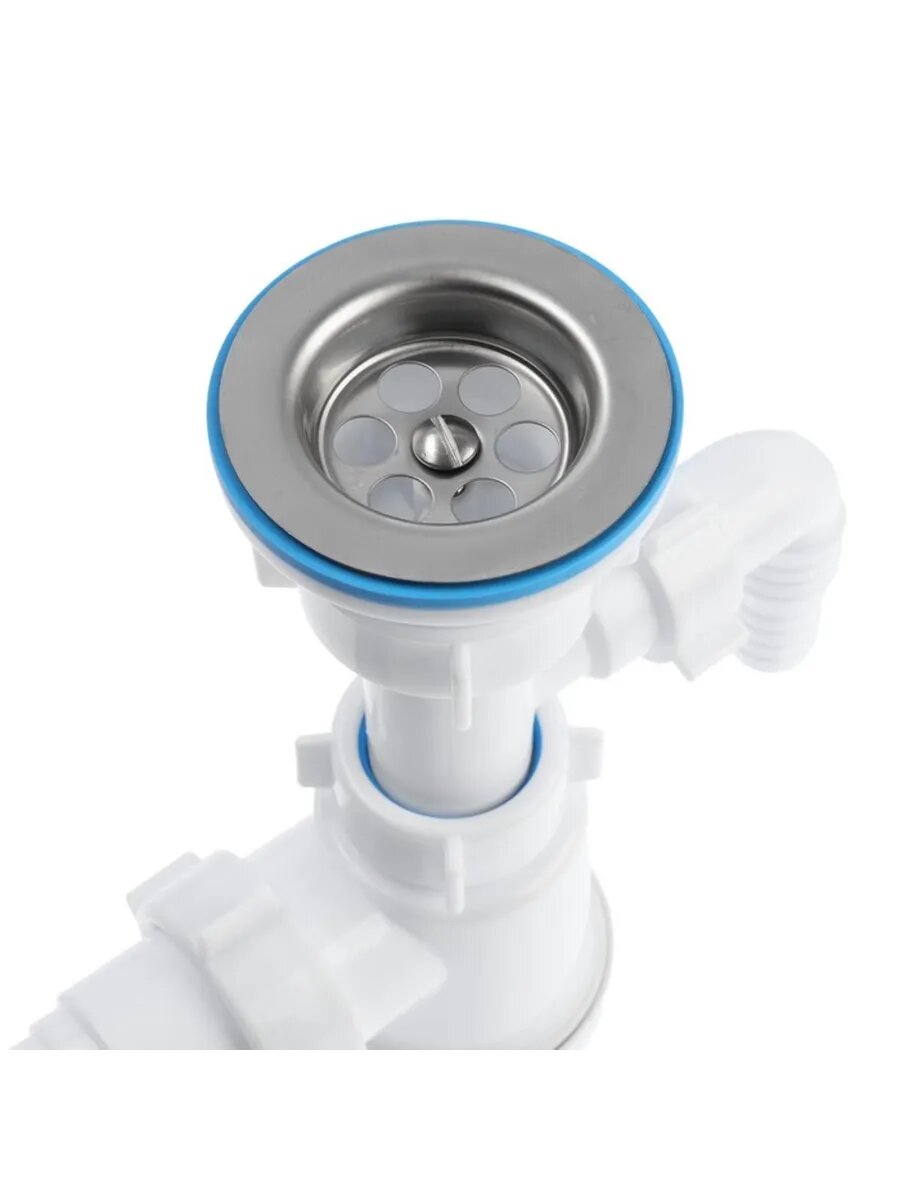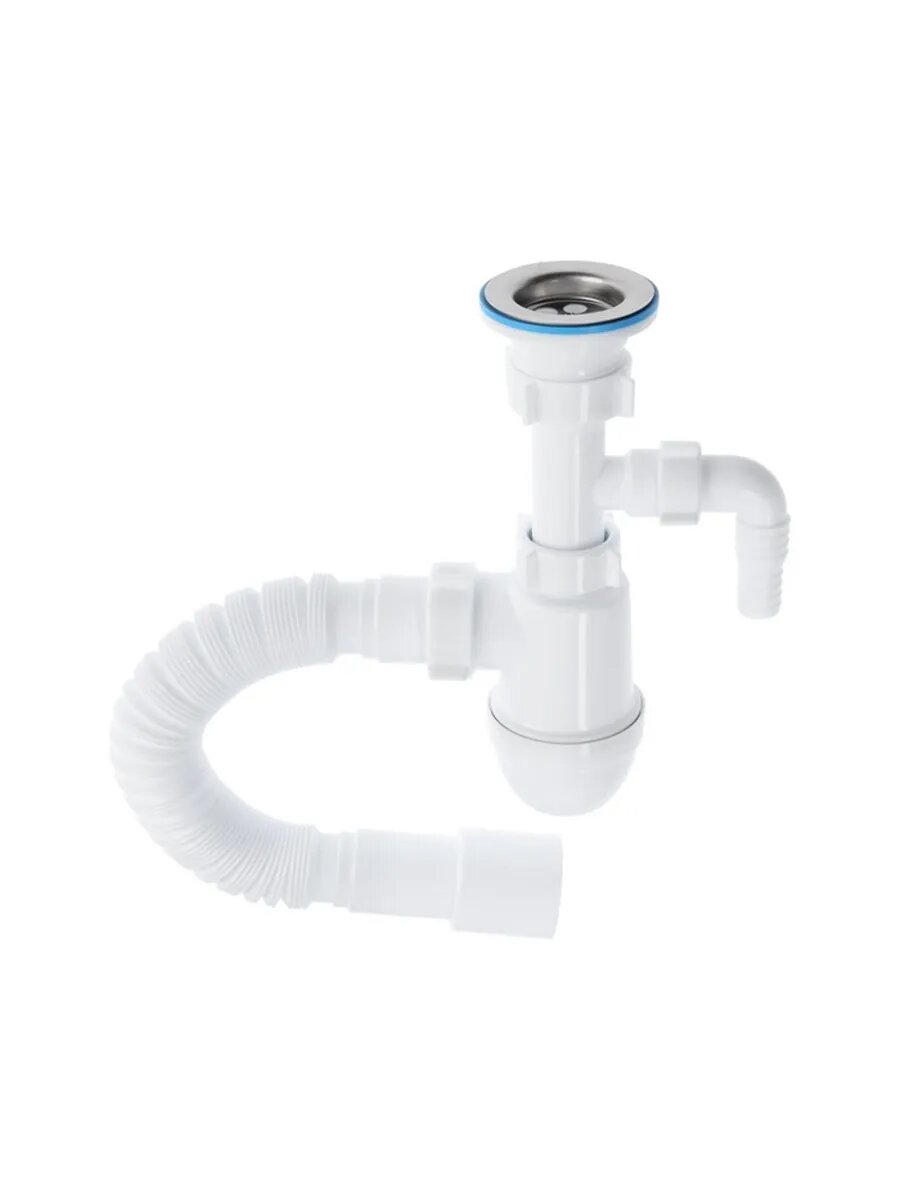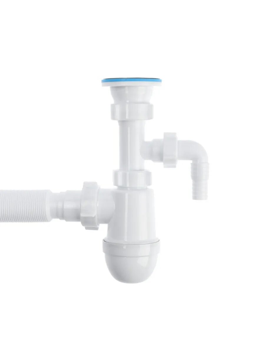 Бутылочный сифон для мойки или раковины c отводом для бытовой техники предназначен для отведения воды в систему канализации. Сифон препятствует проникновению в помещение неприятного запаха, а также звуков льющейся воды в канализационном стояке. Конструкция сифона позволяет проводить его обслуживание и прочистку без применения каких-либо инструментов. Сифон изготовлен по современной технологии из лёгкого и прочного полипропилена, что обеспечивает его надёжность и долгий срок службы. Сифон укомплектован выпуском с решеткой из нержавеющей стали и гибкой трубой.