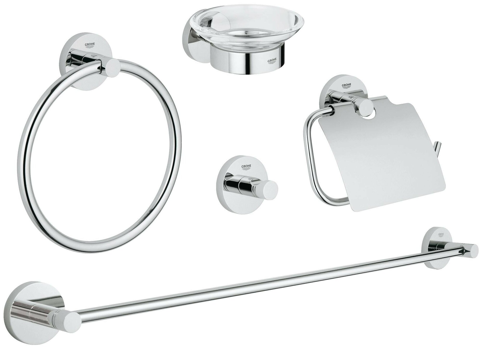 В ванную приобрел набор принадлежностей Essentials 40344001 от GROHE. Знаю по опыту, что фирма не вчера создана и не станут выпускать ширпотреб. Первое по чем оценил набор это вес, уверенно весит пару килограмм, а то и больше. Это значит, что изделия не из порошкового металла, а настоящая нержавейка, или хромированный цветной металл.