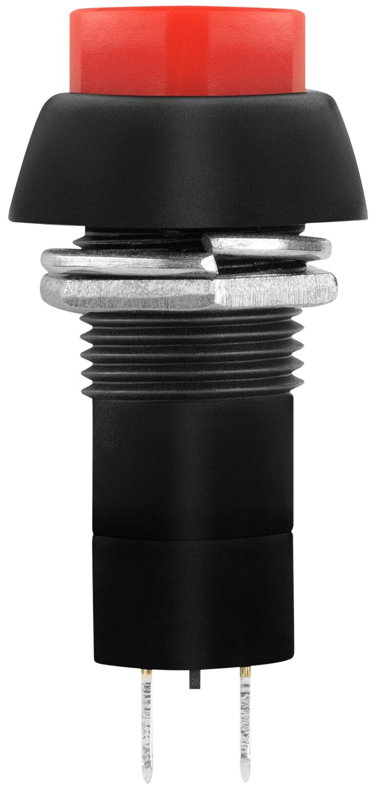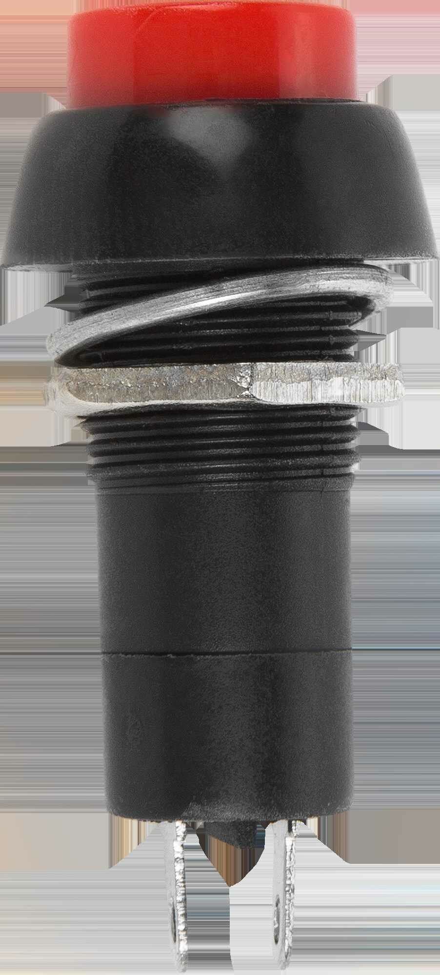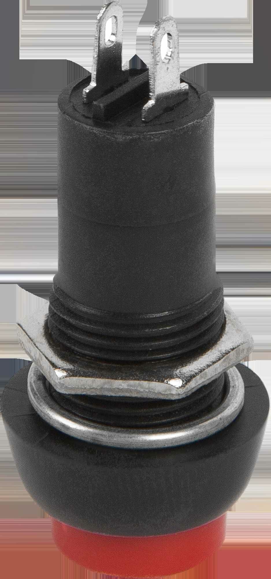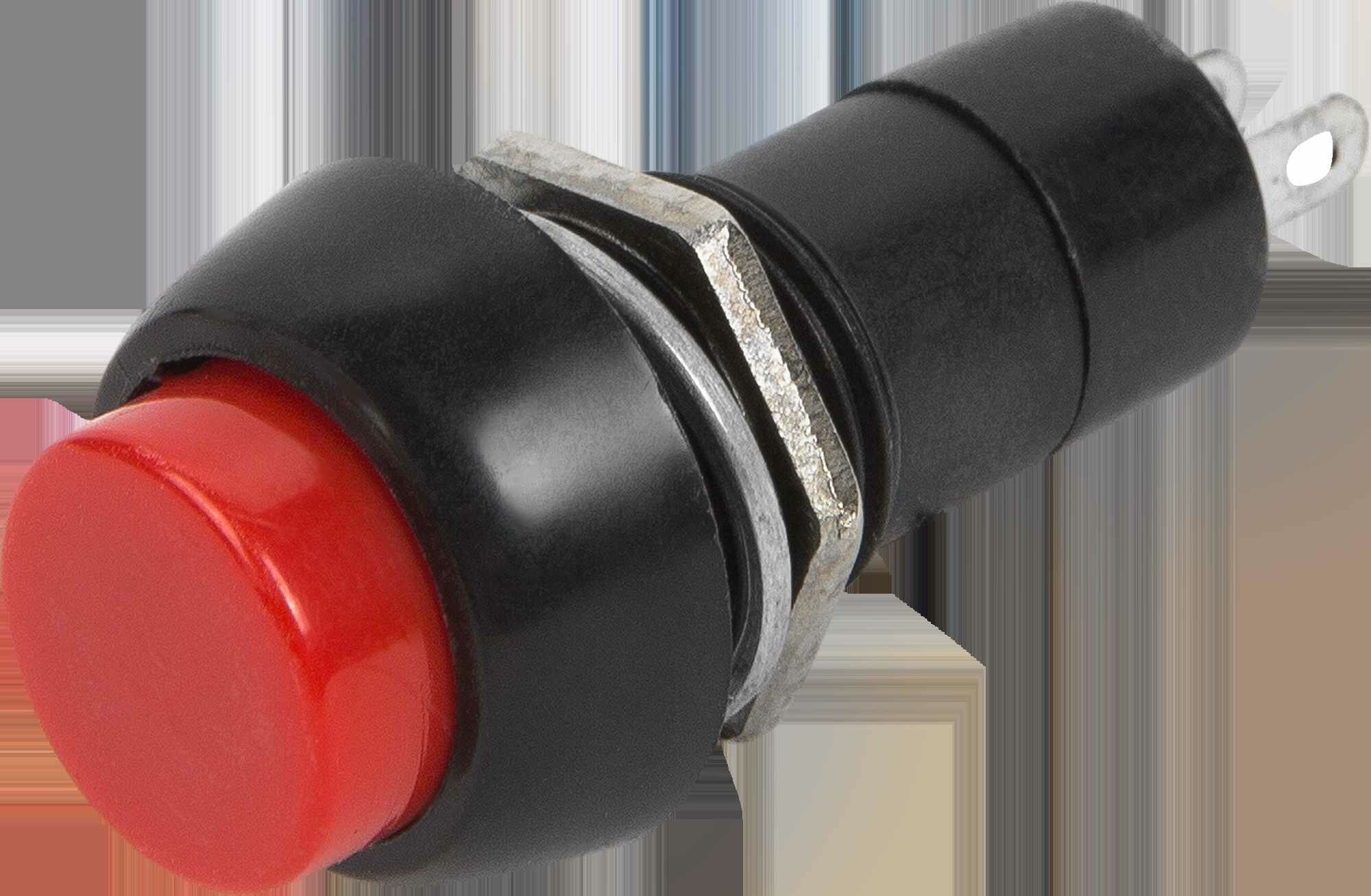 **Нажимная кнопка без фиксации** — Кнопка без фиксации с номинальным напряжением 250В красного цвета является прочным и необходимым приспособлением, которое служит для аварийного выключения приборов. Корпус выполнен из прочного материала, установочный диаметр имеет размер 12 мм.