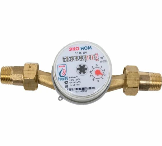 Счетчик воды ЭКО НОМ СВ 15-110 предназначен для измерения объёма питьевой воды по СанПин 2.1.4.1074-01 и сетевой воды, протекающей по трубопроводам систем холодного и горячего водоснабжения. Предназначен для учёта потребления воды преимущественно в квартирах. Удобство монтажа позволяет установить счётчик как в горизонтальном, так и в вертикальном положении с минимальным влиянием на порог чувствительности. Латунный корпус обладает высокой прочностью и коррозийной стойкостью; крыльчатка из полипропилена (PP) выдерживает высокую температуру более 90 °С и значительные нагрузки, не содержит бисфенол А; антимагнитная защита; не чувствительны к качеству воды; длина прямого участка обеспечивается комплектом монтажных частей, входящих в комплект поставки; срок службы - 12 лет.