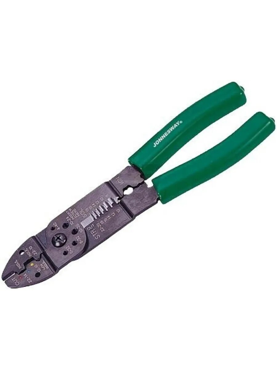Щипцы для обжима и зачистки проводов марки ''Jonnesway''. Инструмент, применяющийся при производстве электромонтажых работ, где используются провода различного сечения и возможна установка контактных клемм. Маркированные, калиброванные элементы рабочей части позволяют производить различные операции без дополнительных настроек и необходимости смены инструмента.