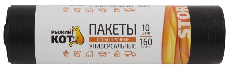 пакеты для мусора РЫЖИЙ КОТ 160л 10шт 25мкм 102х80см черные 160 л; 25 мкм