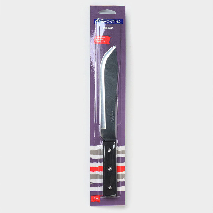 Кухонные ножи TRAMONTINA - качество и удобство использования. Преимущества: Лезвие отличается прочностью и долговечностью заточки. Удобная ручка облегчает хват и предотвращает усталость рук. Эксплуатация: Высококачественные кухонные ножи не рекомендуется мыть в посудомоечной машине. По ряду причин производители ножей рекомендуют исключительно ручную мойку. Сразу после использования ножи должны быть вымыты и высушены, в противном случае лезвия ножей могут потемнеть. Если появились небольшие изменения оттенка стали или пятна на лезвии — используйте для очистки только мягкие, не содержащие хлор или абразивы средства. Ножи лучше всего хранить отдельно от остальной посуды, так как это поможет избежать возможных повреждений режущей кромки и полотна лезвия от посторонних контактов с твердыми предметами. Не храните ножи в традиционном выдвижном кухонном ящике вперемешку друг с другом! Лучше всего их держать в специальной подставке или на магнитном держателе.