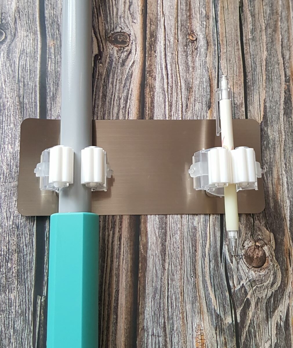 На самоклеящейся основе На 2 шт Размер: 20х7,5 см материал: ПВХ упаковка: блистер Универсальный держатель позволяет размещать предметы любого типа: швабры, садовый инструмент, хозяйственные мелочи, кухонную утварь. Для установки держателя не требуются дополнительные крепления или присоски: клеевой слой обеспечит прочное крепление к поверхности.