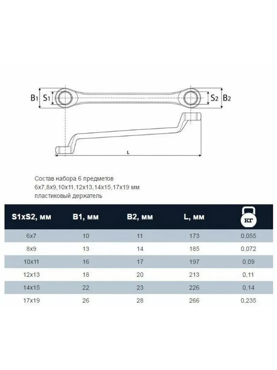 Универсальные гаечные ключи применяются в качестве основного ручного инструмента при проведении работ с высоконагруженными резьбовыми соединениями. Изогнутая рабочая часть облегчает применение ключей в труднодоступных местах. Состав набора из 6 предметов: 6x7, 8x9, 10x11, 12x13, 14x15, 17x19 мм, пластиковый держатель.