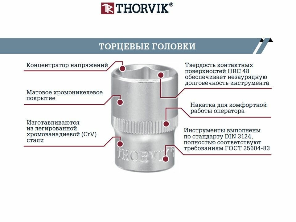 Основная разновидность рабочих насадок сборного слесарно-монтажного инструмента - это торцевая головка. Торцевые головки разделяются по геометрии рабочего профиля, по длине и по назначению. Такие инструменты обеспечивают наилучшие условия для приложения рабочего усилия по сравнению с другими видами инструмента для работы с внешними рабочими профилями. Шестигранный рабочий профиль считается наилучшим с точки зрения приложения максимальных рабочих нагрузок, передаваемых крепежной детали. Система инструмента с присоединительным квадратом 1/2'' DR является сегодня самой универсальной, покрывая самый большой диапазон размеров от 8 до 36 мм. За её рамками находятся лишь несколько самых мелких размеров и размеры крепежа, применяемые в крупногабаритных конструкциях. Данная система самая ''богатая'' по количеству разнообразных насадок, вариантов переходников и приводов и поэтому инструмент с присоединительным квадратом 1/2'' DR является основой, на которой строится вся система сборного слесарно-монтажного инструмента предприятия. Торцевые головки 1/2'' DR позволяют прилагать рабочие нагрузки, которые только в состоянии выдержать резьбовые соединения. Шестигранная торцевая головка увеличенной длины применяется при работе с крепежом на относительно высоких шпильках и заглубленных деталях. Торцевая головка ''Thorvik'' выполнена из легированной хромованадиевой стали, имеет накатку и матовое хромоникелевое покрытие.