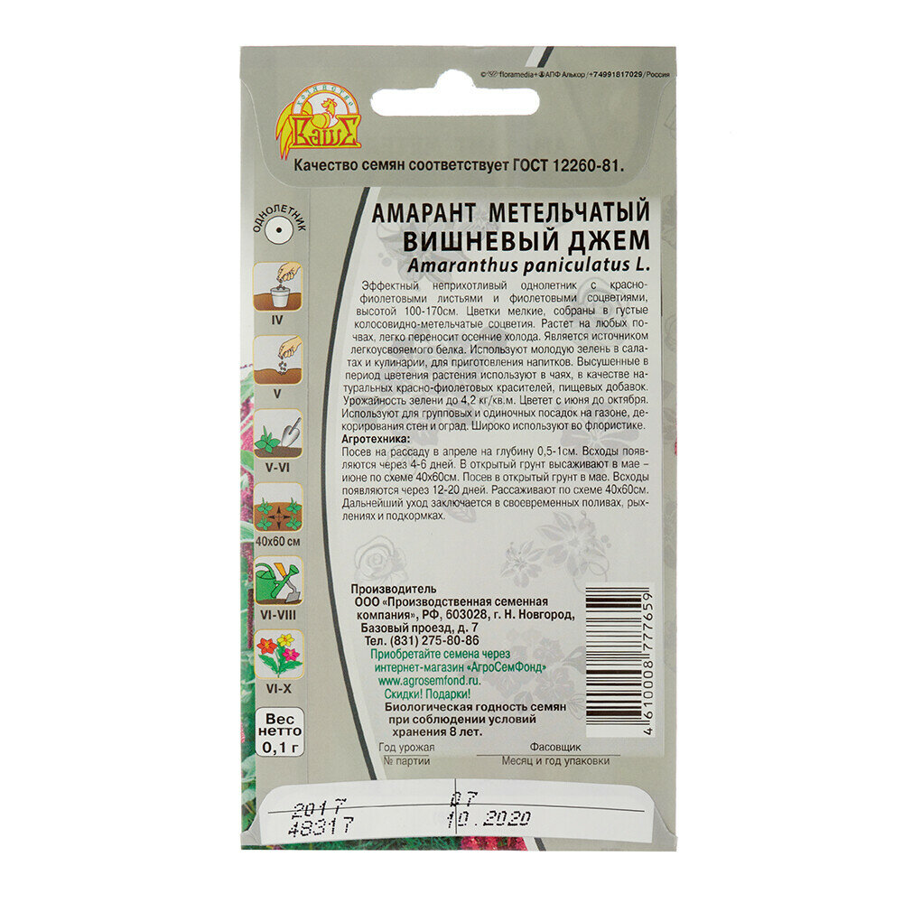 Семена Амарант метельчатый Вишневый джем 0,1г. Эффектный неприхотливый однолетник с красно-фиолетовыми листьями и фиолетовыми соцветиями, высотой 100-170 см. Цветки мелкие, собраны в густые колосовидно-метельчатые соцветия. Растет на любых почвах, легко переносит осенние холода. Является источником легкоусвояемого белка. Используют молодую зелень в салатах и кулинарии, для приготовления напитков. Высушенные в период цветения растения используют в чаях, в качестве натуральных красно-фиолетовых красителей, пищевых добавок. Урожайность зелени до 4,2 кг/кв. м. Цветет с июня до октября. Используют для групповых и одиночных посадок на газоне, декорирования стен и оград. Широко используют во флористике.Амарант МетельчатыйВишневый джемВес: 0,1 г