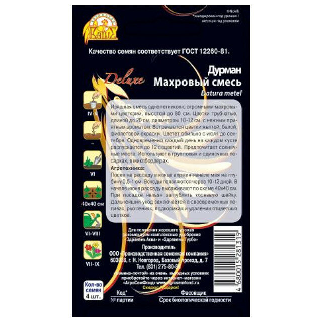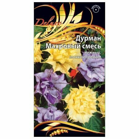 Семена Дурман Махровый смесь 4шт. Изящный однолетник с огромными махровыми цветками высотой до 80 см. Цветки трубчатые, длиной до 20 см, диаметром 10-12 см, с нежным приятным ароматом. Встречаются цветки желтой, белой, фиолетовой окрасок. Цветет обильно с июля до сентября. Одновременно каждый день на каждом кусте распускается до 12 соцветий. Предпочитает солнечные места. Используют в групповых и одиночных посадках, в миксбордерах.Дурман Махровый смесьКоличество: 4 шт