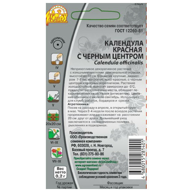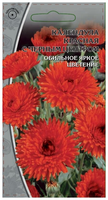 Семена Календула Красная с черным центром 0,2г. Неприхотливое декоративное растение с изящными цветками оригинальной окраски высотой до 60 см. Соцветия крупные, диаметром 7-8 см, махровые, ярко красные с черным центром и красным воротничком. Растение холодостойкое, выносит заморозки до -5°С, предпочитает солнечные места, обладает лекарственными свойствами (антисептик). Цветение обильное с июля по сентябрь. Используют для клумб, рабаток, бордюров и срезки.Календула КраснаяС черным центромВес: 0,2 г