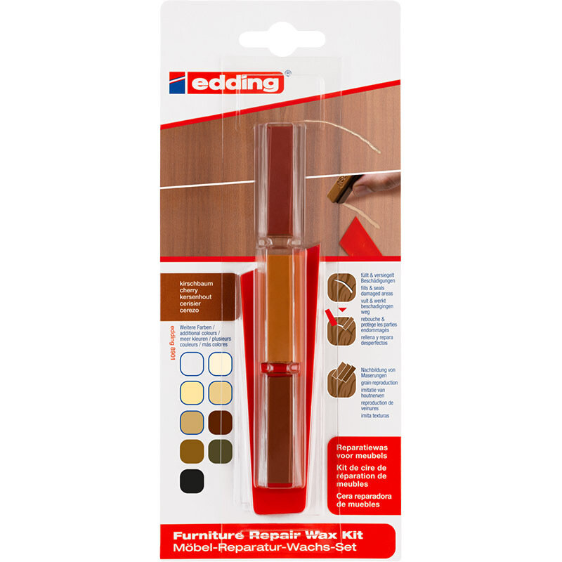 Какая досада! Предмет мебели, который превосходно служит и так же прекрасно выглядит, испорчен отвратительной царапиной. Как вы поступите в такой ситуации? Сохраните ли вы этот предмет мебели и будете каждый раз с раздражением бросать взгляд на злополучную царапину? Вызовите ли вы плотника или даже избавитесь от него? Восковой набор для ремонта мебели edding 8901 поможет вам принять простое решение. Теперь отверстия и даже глубокие царапины на мебели остались в прошлом, а их ремонт стал простым, как никогда.Воск обладает достаточно однородной структурой, позволяющей прочно заделывать им даже вертикальные поверхности или двери. Вы также можете смешивать воски различных цветов: это очень важно в случае ремонта текстурных деревянных поверхностей. Таким образом, этот набор поцарапанной мебели поможет выглядеть, как новой, в считанные минуты.Восковой набор для ремонта мебели: заполнение и ремонт трещин и дыр на мебели или других деревянных поверхностях, как вертикальных, так и горизонтальных.Смешивание воска различных оттенков позволяет добиться имитации древесной текстуры.Мягкий воск для ремонта состоит из смеси минеральных восков и окрашен земельными и оксидными пигментами.В продаже доступны 10 различных наборов, каждый из которых включает в себя воск 3 цветов и пластмассовый шпатель.Характеристики:Практически без запаха.Водостойкий.Не размазывается.Светостойкий.Точное и чистое нанесение.Набор включает в себя 3 смешиваемых оттенка, что позволяет воспроизвести текстуру древесины; в продаже имеются наборы с различными комбинациями цветов.Высококачественный фирменный продукт.Произведено в Германии.Применение:Очистите поверхность и с помощью шпателя удалите любые отколовшиеся или отслоившиеся материалы.Размягчите воск путем нагревания (например, с помощью расплавителя).Заполните основу: Используйте воск того цвета, который соответствует цвету поверхности. Кончиком шпателя наберите небольшое количество мебельного воска (или нанесите цветной воск без использования шпателя), заполните им поврежденный участок и вдавите его внутрь.Скорректируйте цвет: Вотрите в воск для ремонта мебели, использовавшийся для заполнения основы, воск более темного или более светлого оттенка. Совет: Воспользуйтесь кромкой шпателя для того, чтобы воссоздать структуру древесины.Очистка: Шпателем удалите излишки воска вокруг поврежденного участка.