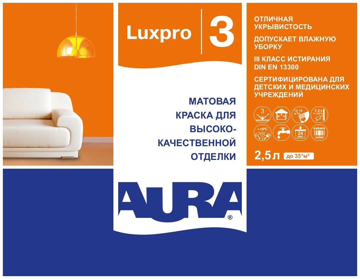 Матовая краска для высококачественной отделки. После высыхания образует абсолютно матовое покрытие (степень блеска 3), скрывающее погрешности нанесения и неровности поверхности. Допускает легкую влажную уборку (III класс износостойкости по DIN EN 13300). Экологичная, содержание ЛОС (летучие органические соединения) соответствует директиве Европейского Союза 2004-42-CE. Сертифицирована для детских и медицинских учреждений. Колеруется по системе Eskarocolor в пастельные и насыщенные тона (База А, TR).