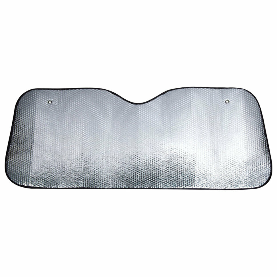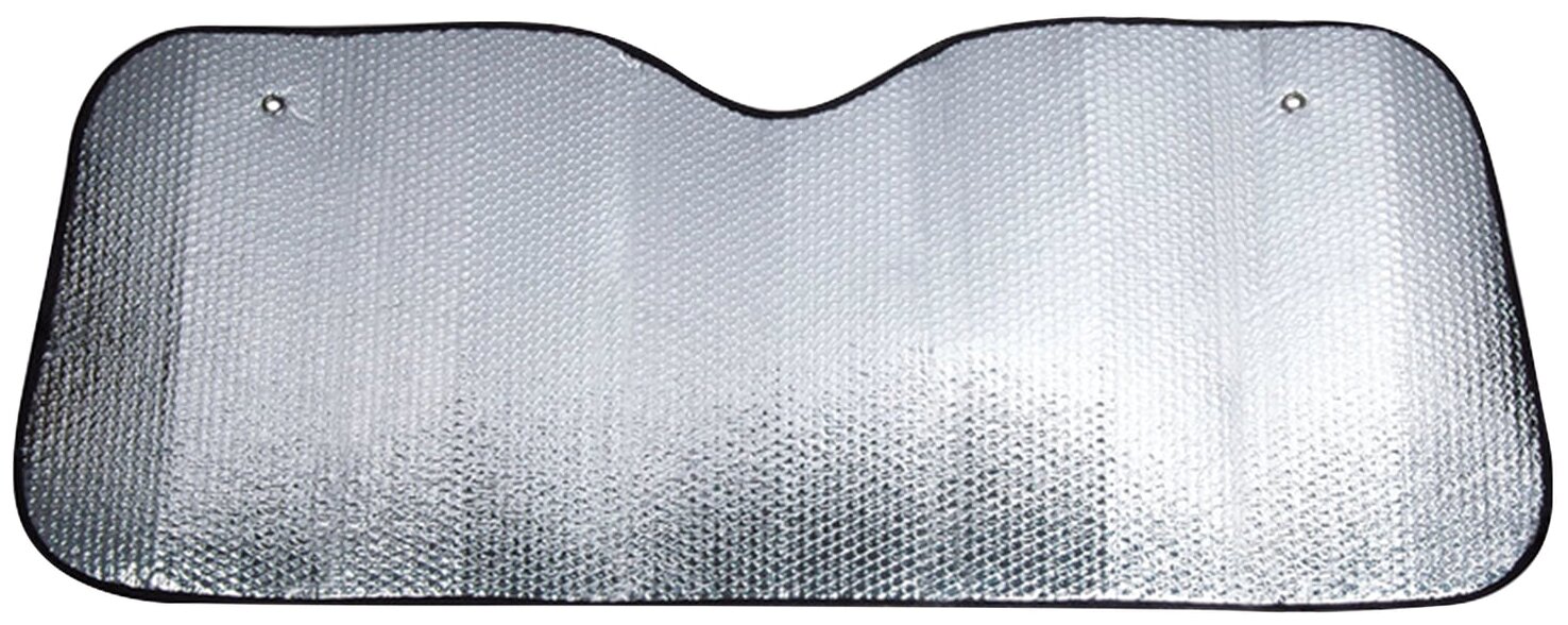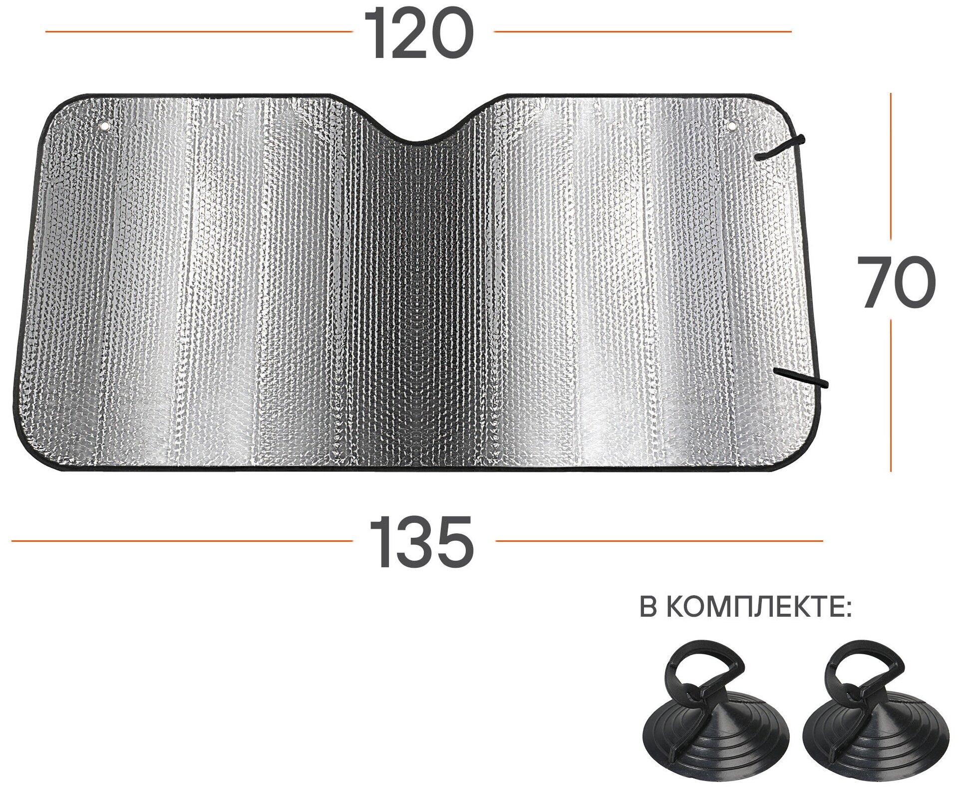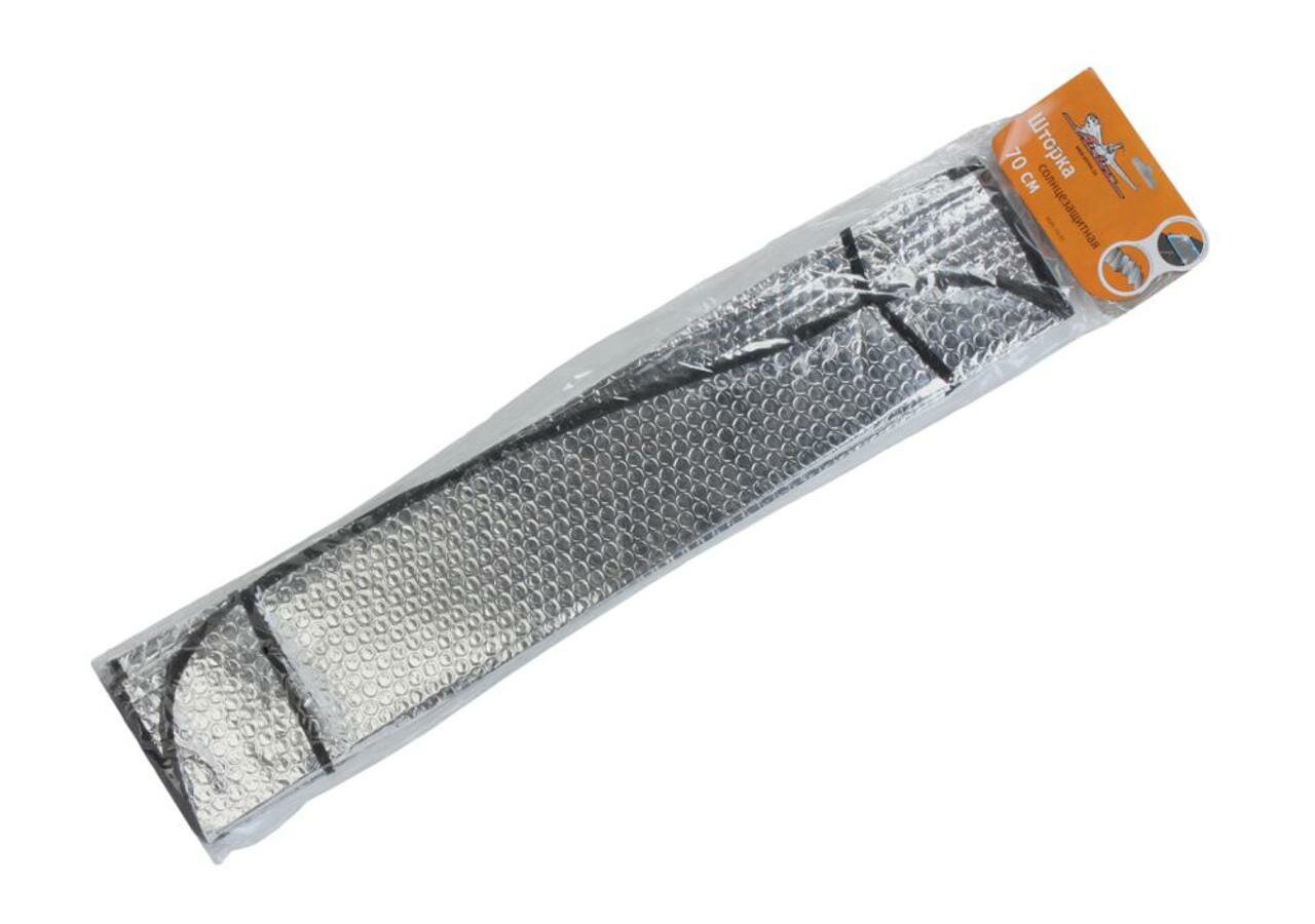 Двусторонняя солнцезащитная шторка размером необходима для блокировки попадания солнечных лучей со стороны лобового стекла в салон машины. Серебристая поверхность шторки отражает солнечные лучи, защищая салон и торпеду автомобиля от нагрева. Крепится к лобовому стеклу с помощью двух присосок. Высота шторки 70 см - идеальна для средне размерных автомобилей.