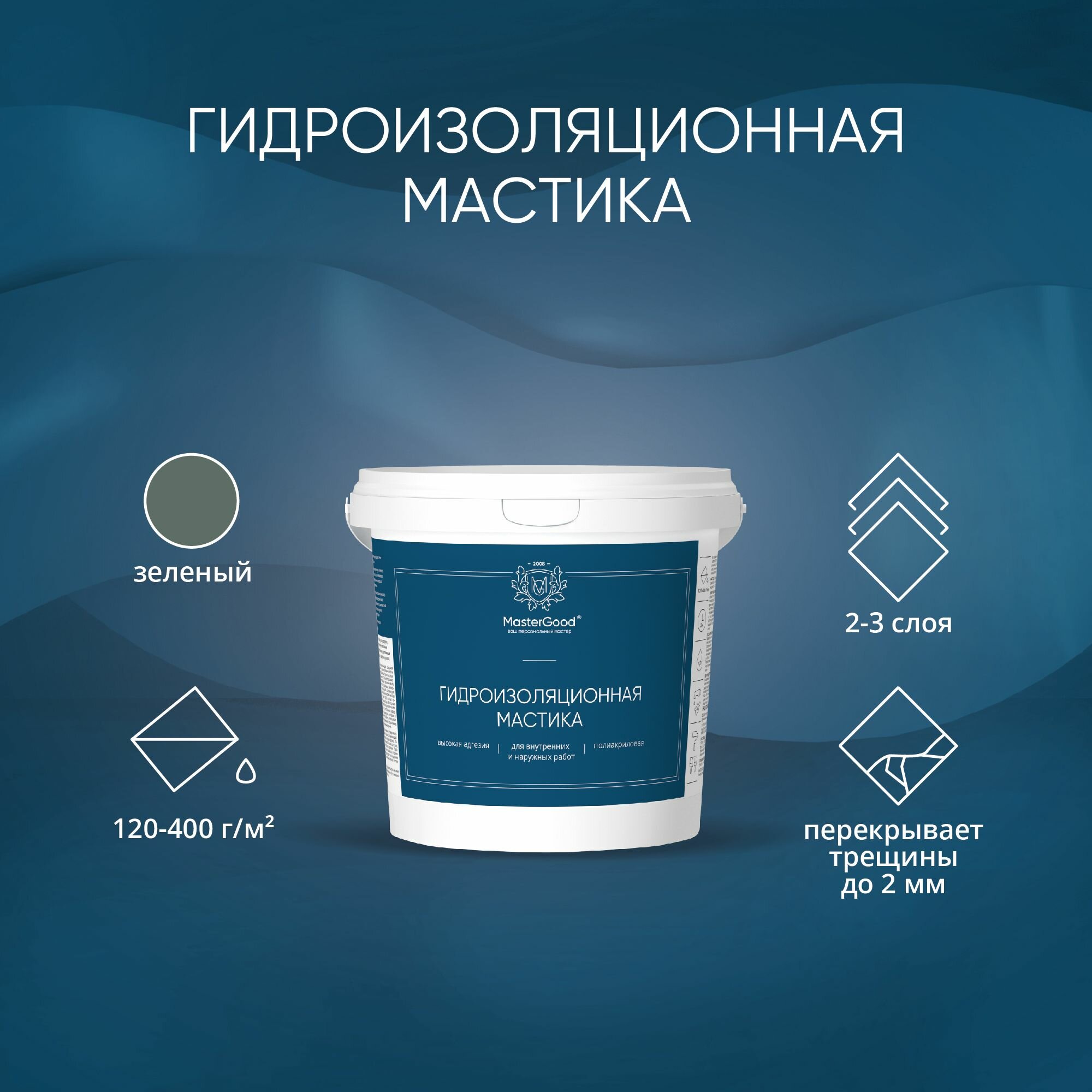 Гидроизоляция MasterGood 1.3 кг MG-Гидроиз-1,3 - готовый состав для создания бесшовной гидроизоляции внутри и снаружи влажных помещений. Обладает высокой адгезией к минеральным основаниям (бетон, штукатурка, кирпич и т. д.), металлам, дереву, гипсокартону и пластику.Благодаря высокой паропроницаемости, можно наносить материал на недостаточно хорошо высушенные основания.Минимальная рекомендуемая толщина гидроизоляционной пленки 0.4 мм.Характеристики:Применяется для работ по бетону, штукатурке, кирпичной кладке, гипсокартону, гипсовым штукатуркам, дереву, фанере, пластику во влажных помещениях;Не содержит растворителей;Не имеет запаха;Состав сохраняет свои свойства до 10 циклов кратковременного замораживания при температуре до -20°С;В зависимости от толщины слоя и впитываемой поверхности при температуре 20°С и влажности не более 70% время высыхания однослойного покрытия на отлип не более 2 часов;Полное высыхание не менее 24-36 часов после нанесения последнего слоя;Использовать при температуре не ниже +10°C и не выше +35°C.