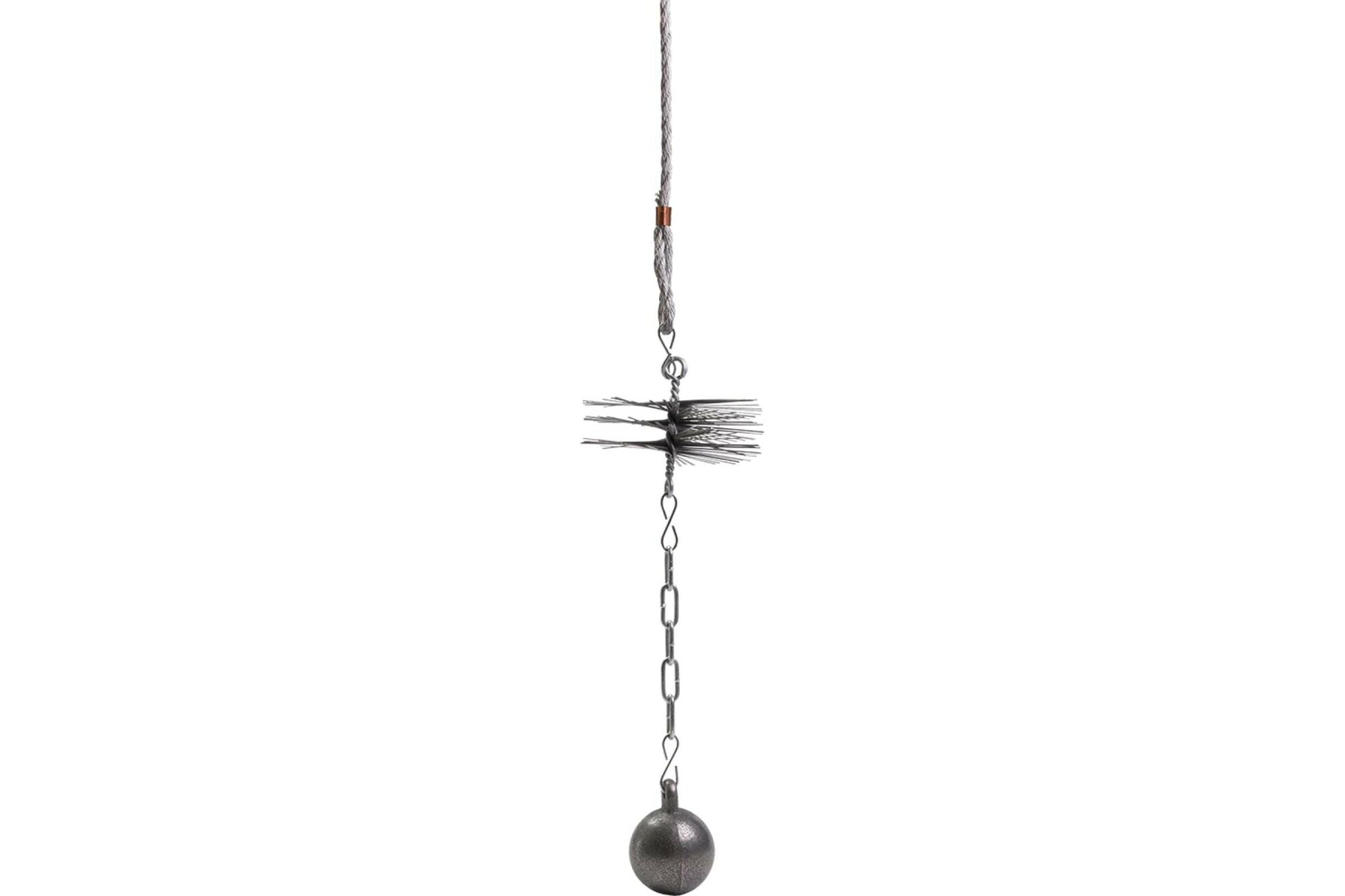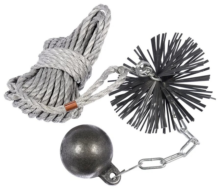 Набор для чистки дымохода d-150 мм Печные штучки VORTEX применяется для механической чистки дымохода. Необходимые элементы уже включены в набор : металлический ерш, груз и трос. Набор легко очищает дымоходы, вентиляционные шахты от пыли, мусора, грязи и креозотных отложений. Удобность использования. Предотвращает возгорание сажи в дымоходах.Выполнены из качественных материалов, что обеспечивает долгий срок службы. Дополнительные характеристики:Верёвка (трос): нейлон, полиэтилен;Цепь и груз с крючком: железо;Щётка (ёрш): нержавеющая сталь.. Материал: сталь . Количество в наборе: 3 шт. Цвет: серебро . Габариты без упаковки: 150*150*10000 мм. Вес нетто: 1.9 кг.