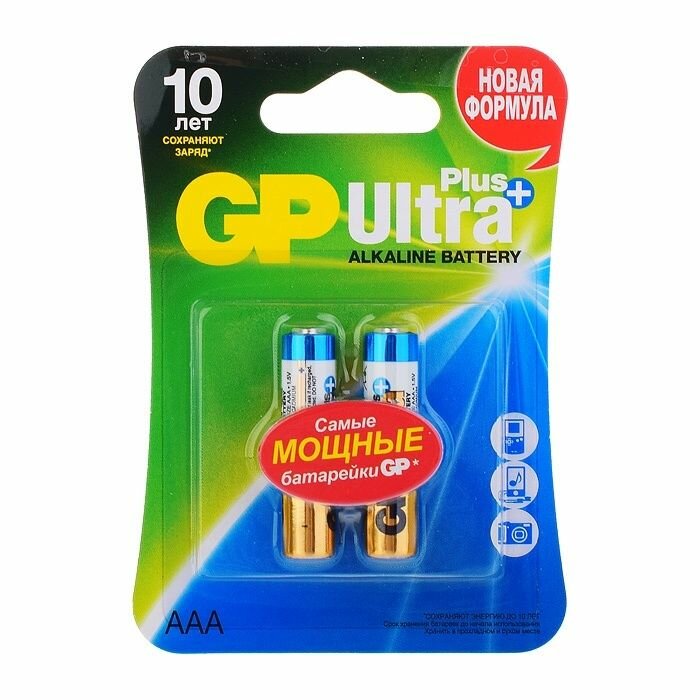 ПРЕИМУЩЕСТВАБатарейки GP Ultra Plus Alkaline – это самые мощные алкалиновые батарейки. Батарейки гарантируют бесперебойную и надежную работу устройствам с высоким энергопотреблением. Согласно результатам тестов специалистов GP, энергии Ultra Plus Alkaline на 30% больше, чем у обычной щелочной батарейки.Если вам нужны элементы питания для фототехники, портативных ТВ, аудиоустройств, машин на радиоуправлении, то батарейки GP Ultra Plus Alkaline типоразмера ААА станут хорошим выбором. Блистерная упаковка надежно защищает элементы питания от трения и других механических воздействий.Срок годности батареек GP группы Ultra Alkaline достигает 10 лет, а потери емкости заряда за время хранения не превышают 10% от изначального.БЕЗОПАСНОСТЬGP 24AUP-2CR2 абсолютно безопасны для всех членов семьи, и могут применяться в детских игрушках и ночниках, так как не содержат кадмия и ртути.При использовании элементов питания соблюдайте правила эксплуатации: не вставляйте одновременно в устройство батарейки разных химических систем и производителей. При установке батареек в устройство, всегда соблюдайте полярность. Запрещается деформировать, разбирать, бросать в огонь или самостоятельно перезаряжать батарейки. Не допускайте короткого замыкания и не давайте батарейки детям в качестве игрушек.Батареи GP Batteries соответствуют требованиям ГОСТ и международным стандартам контроля качества ISO9001 и ISO14001.