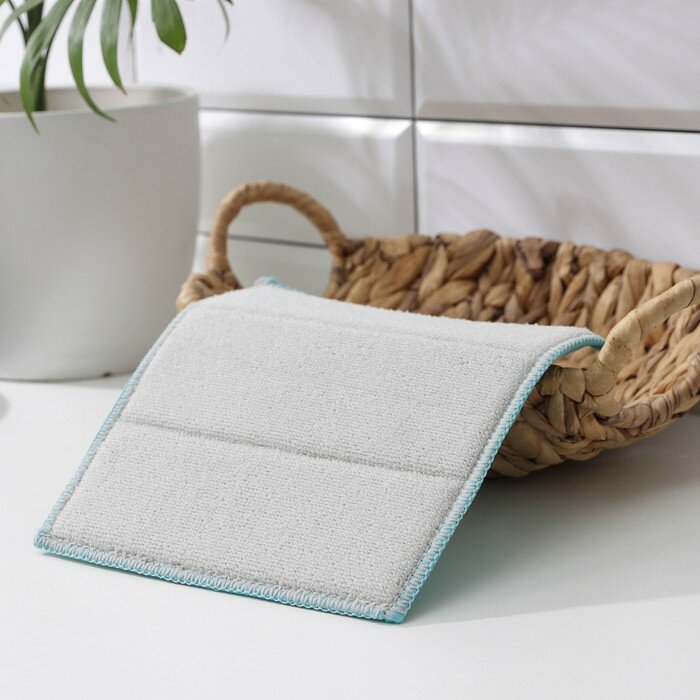 Внешний слой из микрофибры удаляет жир и грязь, не оставляя разводов, даже без использования моющих средств. Внутренний слой из поролона надёжно удерживает влагу. Подходит как для сухой, так и для влажной уборки любых типов поверхности, особенно на кухне. Может использоваться для сушки посуды и полировки гладких поверхностей.