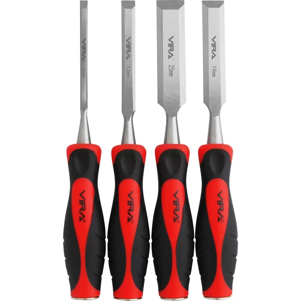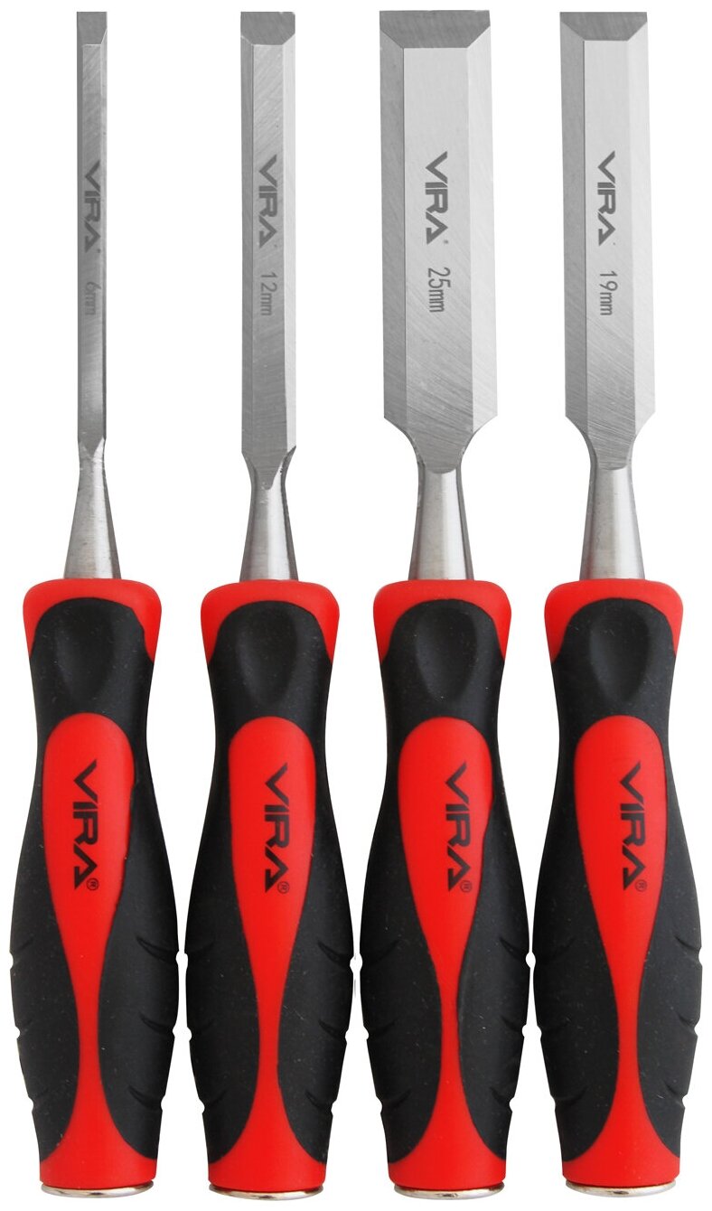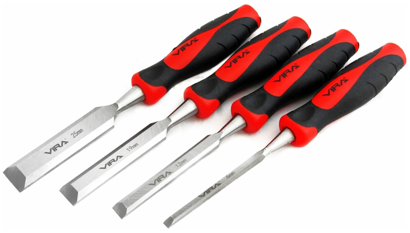 **Стамеска Vira ** — это набор из четырех плоских стамесок длиной 140 мм. Они применяются для выполнения столярных и слесарных работ. Инструменты оснащены двухкомпонентными рукоятками, которые обеспечивают удобный захват, и рабочей частью из хромованадиевой стали.