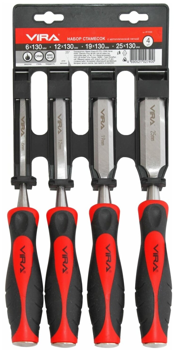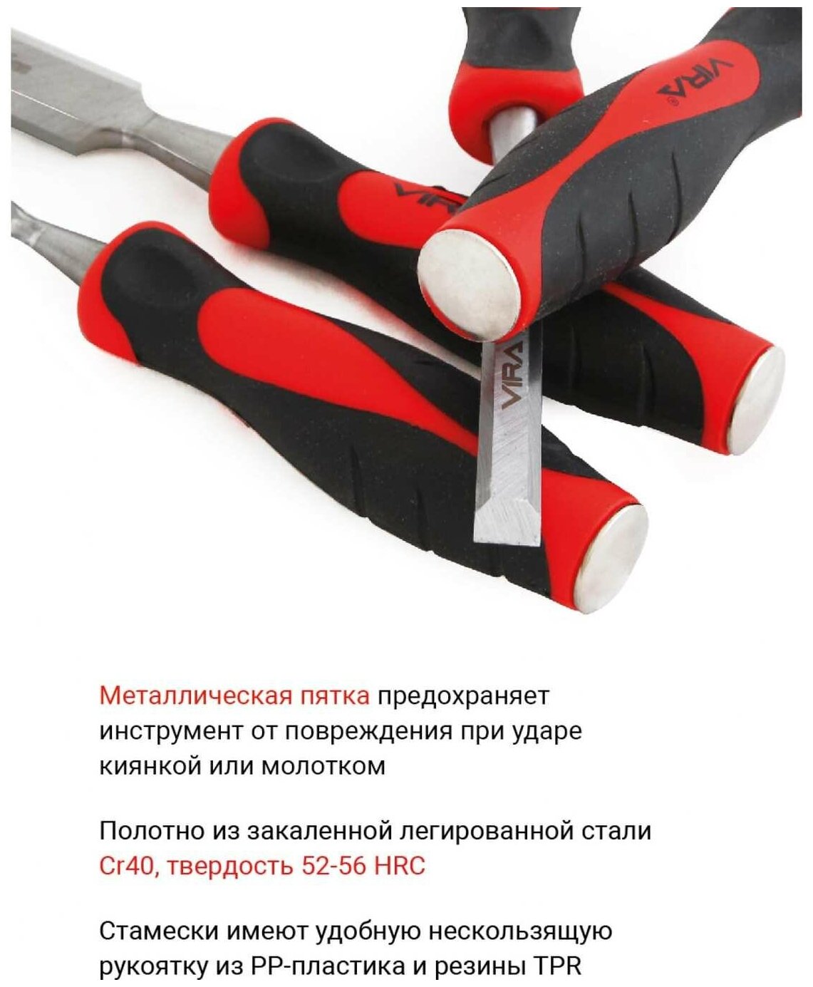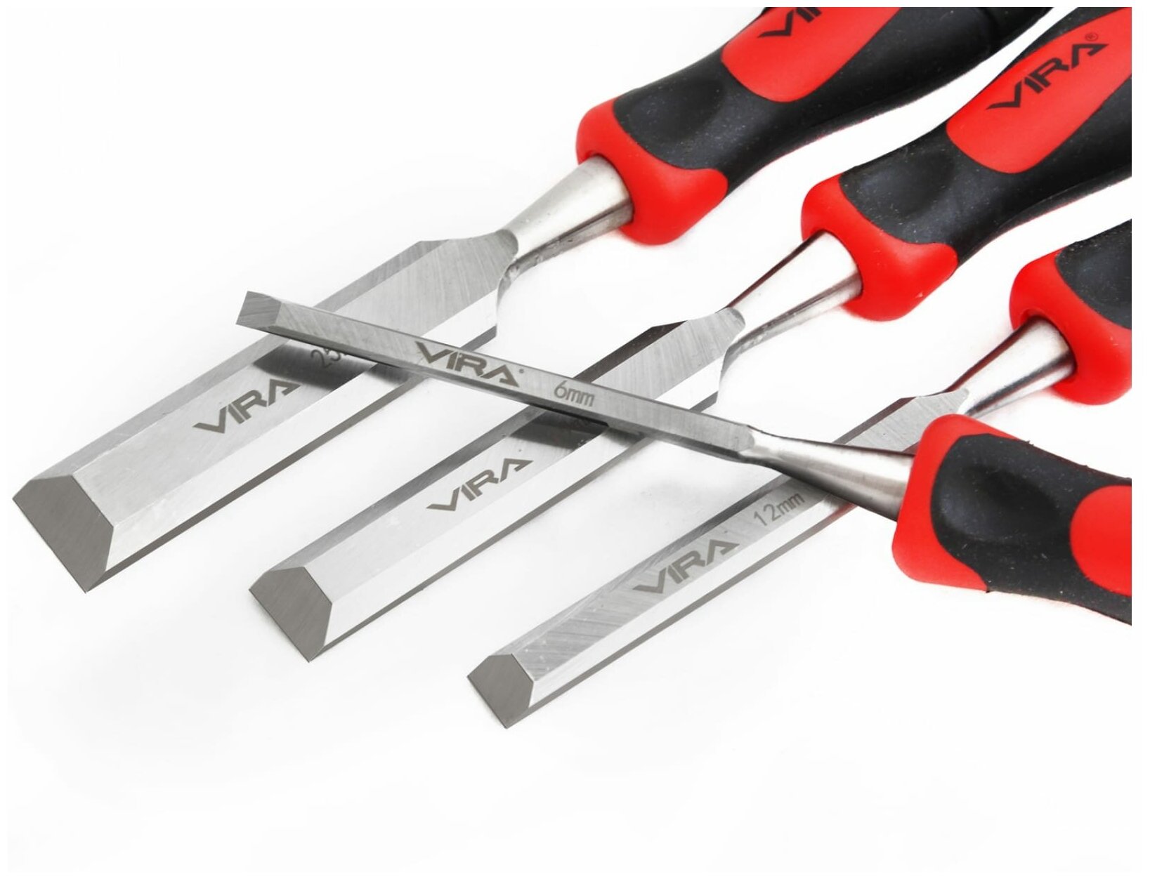 **Стамеска Vira ** — это набор из четырех плоских стамесок длиной 140 мм. Они применяются для выполнения столярных и слесарных работ. Инструменты оснащены двухкомпонентными рукоятками, которые обеспечивают удобный захват, и рабочей частью из хромованадиевой стали.