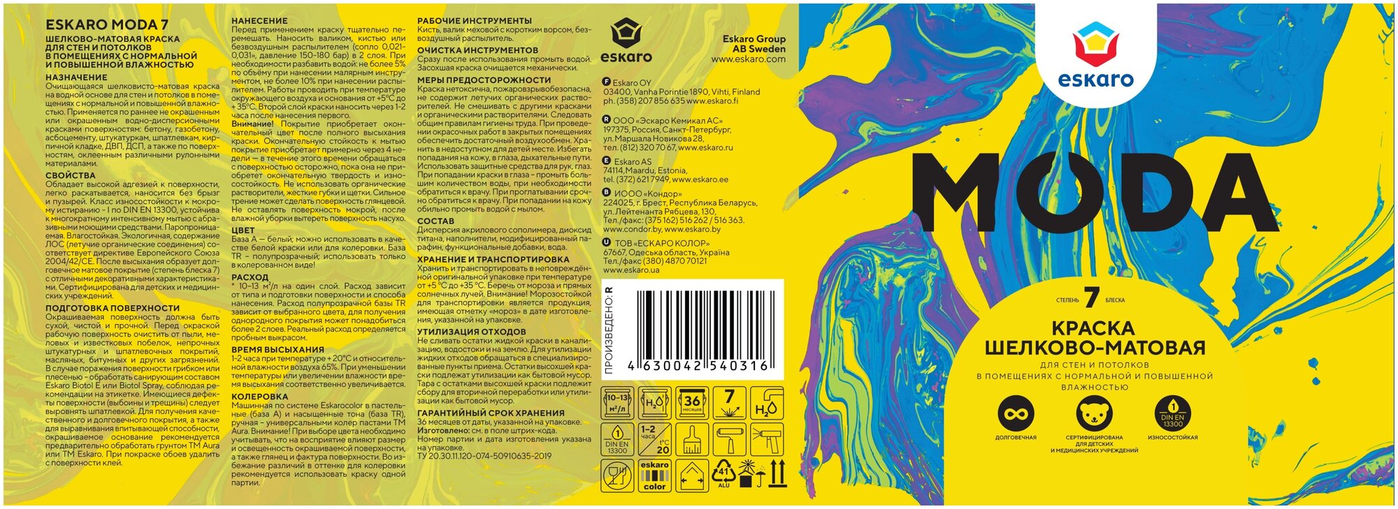 краска акриловая ESKARO Moda 7 база А для стен и потолков 27л белая арт.4630042540323