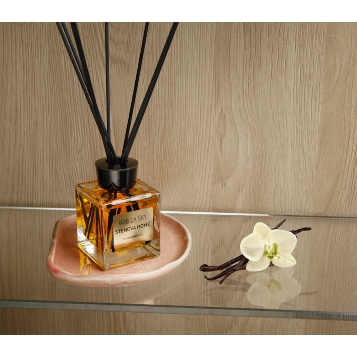 **Ароматический диффузор Stenova Home Vanilla Sky** наполнит помещение выразительным и приятным ароматом. Аксессуар выполнен в виде оригинальной компактной емкости из стекла. Внутри находится слегка вязкая ароматизированная жидкость. В широкое горлышко вставляются стики-палочки, больше похожие на индуистские ароматические свечи. Для изменения интенсивности аромата необходимо варьировать количество стиков или переворачивать их.